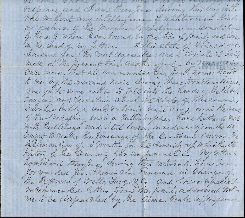 Since my sojourn in this city, which dates back to the middle of October last, I have written sundry and various letters to the members of the family at home, to none of which have I as yet received any response and I am therefore during this long interval without any intelligence of whatsoever kind or nature of the movements, welfare or condition of those to whom I am bound by the ties of family and love, in the land of my fathers. This state of things is not, I assure you, the most agreeable; and to obviate it I will make at the present time another effort by remarking once more, that all communications from home sent to me by the overland mail during these troublous times, are quite sure either to fall into the hands of the Rebels hanging and prowling about the State of Missouri, burning bridges and robbing mail bags, or in the event of their escaping such a catastrophe, have hitherto met with the delays and total losses, incident upon the attempt to make the passage of the Continent during the inclemencies of a winter for the severity of which, the history of the county has no parallel. My letters homeward, therefore, during this interval, have been forwarded per Steamer via Panama in charge of the Express of Wells, Fargo & Co. and I have especially recommended letters from the family addressed to me to be dispatched by the same route in preference to having them subjected to the uncertainties and vicissitudes of the Overland Mail.