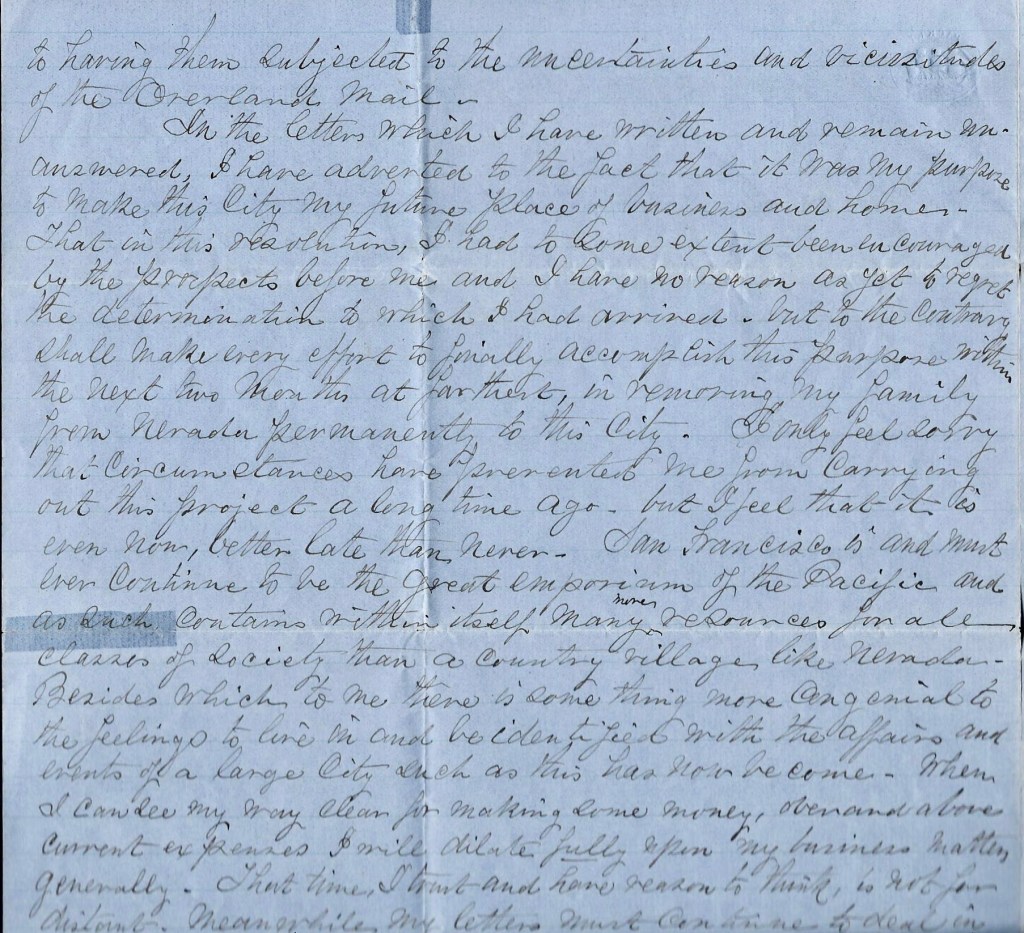 In the letters which I have written and remain unanswered I have adverted to the fact that it was my purpose to make this City my future place of business and home. That in this resolution, I had to some extent been encouraged by the prospects before me and I have no reason as yet to regret the determination to which I had arrived, but to the contrary shall make every effort to finally accomplish this purpose within the next two months at farthest, in removing my family from Nevada permanently to this City. I only feel sorry that circumstances have prevented me from carrying out this project a long time ago, but I feel that it is even now, better late than never.