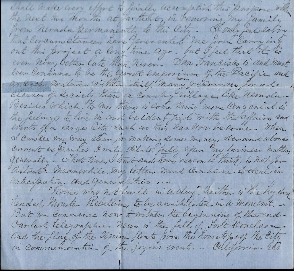 Our last telegraphic news is the fall of Fort Donelson and the flag of the Union floats from the housetops of the City in commemoration of the joyous event. California has been from the first as loyal as any State of the Union and her great heart throbs in unison with her loyal sister States east of the Rocky Mountains. Sarah asked me some time since whether when this foul rebellion is once crushed, we would ever again become in sentiment—as well as in name—a united people. My reply is most emphatically in the affirmative. The acrimony which now exists on the part of the South had its origin in an unjust prejudice based upon almost inexcusable ignorance as to the real sentiments and feelings of the North. When the truthful page of history commences to make the record of this eventful period, this and future generations of southern men—when the passions of the human heart have subsided and reason reigns once more supreme—will peruse that page thoughtfully & dispassionately, and when the task is done, they will acknowledge with shame their ingratitude, their madness, and their blindness in the suicidal course they have pursued.