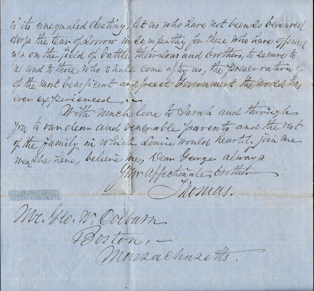 This letter was written by 46 year-old Thomas Wainwright Colburn (1816-1882), the son of dry goods merchant Joshua Colburn (1783-1873) and Eunice Jones (1784-1871) of Boston, Suffolk county, Massachusetts. Thomas wrote the letter to his older brother, George Wood Colburn (1814-1896) who married Sarah Hovey Foster (1820-1914) in 1842.