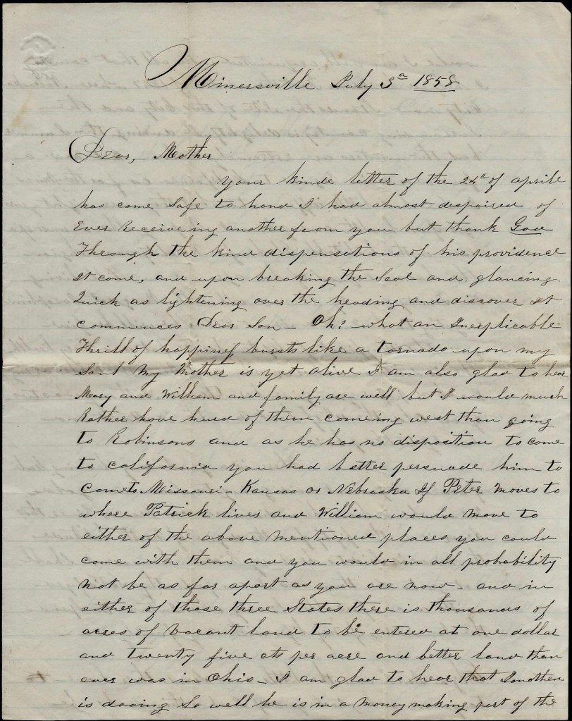 Your kind letter of the 24th of April has come safe to hand. I had almost despaired of ever receiving another from you but thank God, through the kind dispensations of His providence, it come, and upon breaking the seal and glancing quick as lightning over the heading and discover it commences, “Dear Son”—Oh! what an inexplicable thrill of happiness bursts like a tornado upon my soul. My mother is yet alive! I am glad to hear Mary and William and family are well but I would much rather have them coming West than going to Robinsons and as he has no disposition to come to California, you had better persuade him to come to Missouri—Kansas—or Nebraska. If Peter moves to where Patrick lives and William would move to either of the above mentioned places, you could come with them and you would in all probability not be as far apart as you are now. And in either of these three states, there is thousands of acres of vacant land to be entered at one dollar and twenty-five cents per acre and better land than ever was in Ohio.