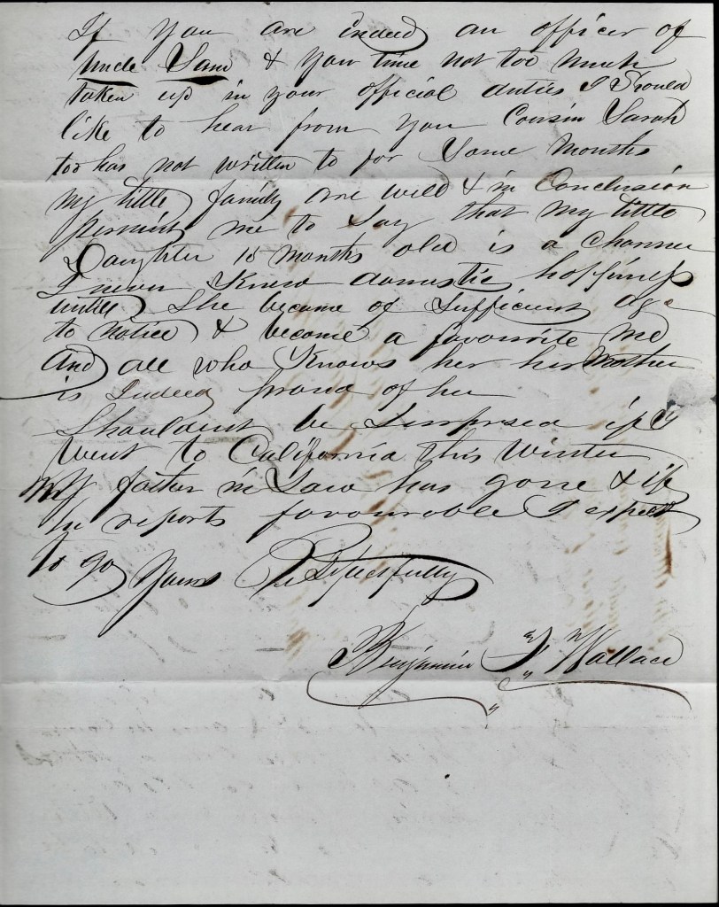 Shouldn’t be surprised if I went to California this winter. My father-in-law has gone & if he reports favorable, I expect to go. Yours respectfully, — Benjamin F. Wallace