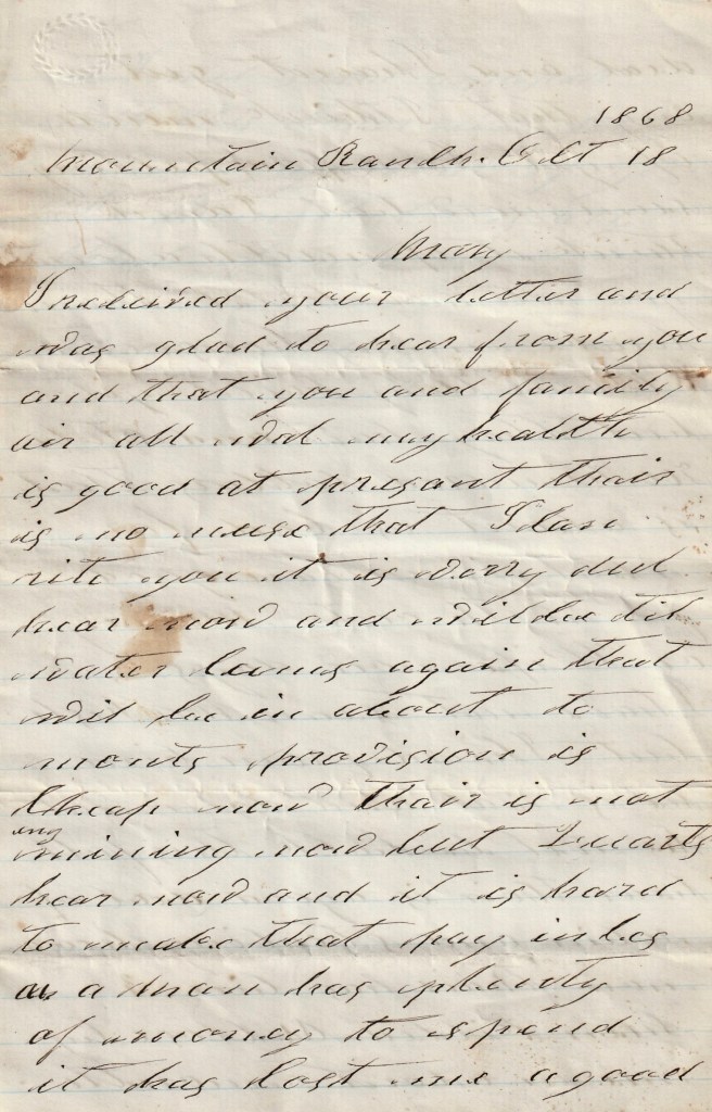I received your letter and was glad to hear from you and that you and family are all well. My health is good at present. There is no news that I can write you It is very dead here now and will be till water comes again. That will be in about two months. Provisions is cheap now. There is not any mining now but quartz here now and it is hard to make that pay unless a man has plenty of money to spend. It has cost me a good deal and I Han’t got any that. I think much of yet. I am prospecting some now but I don’t think it of much account.