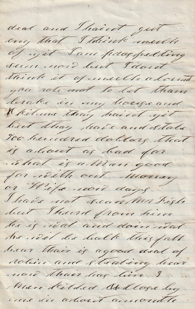 You wrote not to let them break in my house and kill me. They hain’t yet but they have stole 500 hundred dollars. That is about as bad for what is a man good for without money or wife now days.