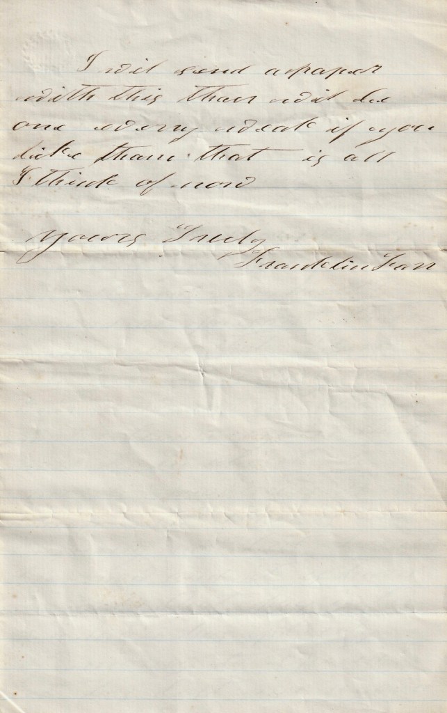 I went down our river the first of June to St. Louis in company with Mr. Fisher from Ottoway [Ottawa]. He told me you was as one of his own sons, you having studied law with a son of his [see George Smith Fisher (1823-1895)]. He seemed to be very much of a gentleman. If you are indeed an officer of Uncle Sam & your time not too much taken up in your official duties, I should like to hear from you. Cousin Sarah too has not written to [us] for several months. My little family are well & in conclusion, permit me to say that my little daughter 15 months old is a charmer. I never knew domestic happiness until she became of sufficient age to notice & become a favorite [to] me and all who knows her. Her mother is indeed proud of her.