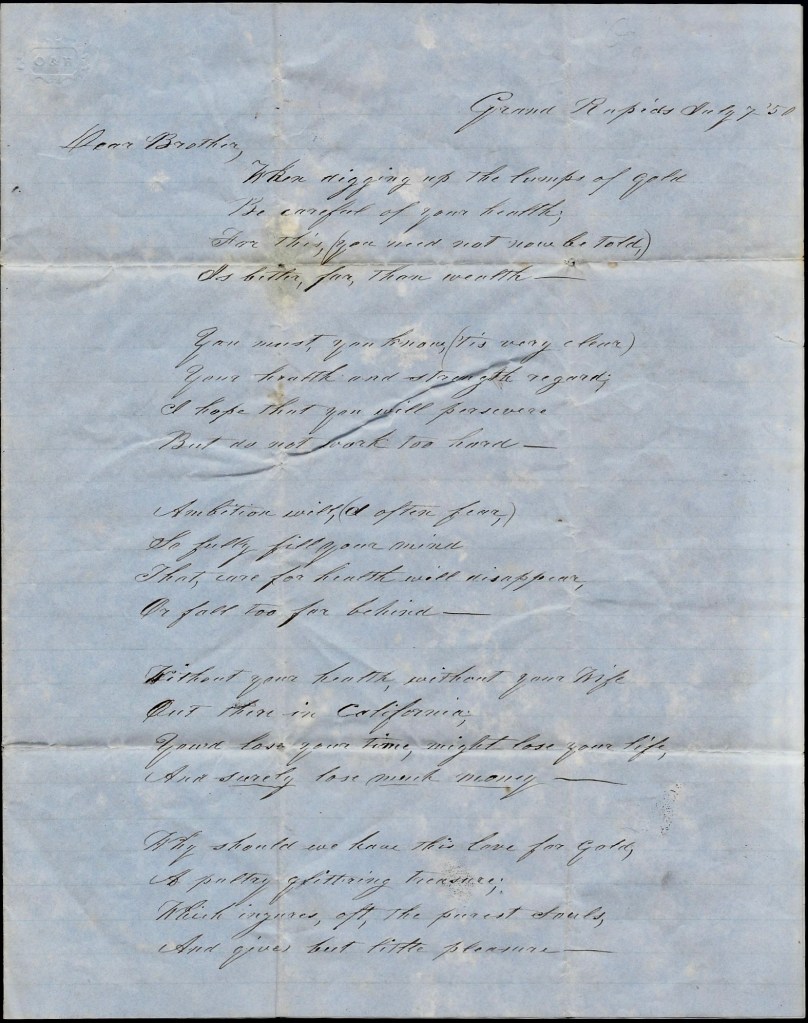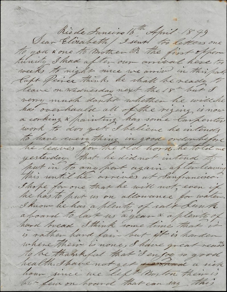 John wrote the letter in April 1849 from Rio de Janiero, Brazil, while enroute to the California gold fields as a member of the Suffolk Mining Company. The members of this company included “a clergyman, physician, lawyer, carpenters, tailors butchers, &c.” Newspaper notices pertaining to the company claim that the “company go on strictly temperance principles and pledge themselves to abstain from gambling and labor on the Sabbath.” The 21 member company was lead by Rev. Hiram Cummings (1810-1887)—an anti-slave lecturer. Other members included: F. E. Baldwin, E. A. Kendall, J. R. Carr, L. Cleaves, Joseph A. Whitmarsh, Humphrey Jameson, Hiram W. Colver, Amasa Bryant, Edwin Faxon, John Gregory, Jr., J. W. Gay, Thomas Emery, A. Sigourney, Leonard F. Rowell, Henry Soule, Peletiah Lawrence Bliss, S. W. Grush, W. H, Tupper, John Holman, S. N. Fuller, M. Bruwer, H. M. Adams, Enoch Burnett, Jr., H. E. Gates, James Gibbens, G. A. Hall, R. C. M. Boynson, F. Z. Boynson, B. White, A. 0. Lindsay, C. T. Mallett, E. B. Kellogg, Henry Hancock, George C. Cargoll, Henrick Cummings, Joseph C. Trescott, G. W. Colby, Albert Cook, Francis S. Frost, Albert Merriam, John Hancock, D. C. Smith, J. Lindsay, S. A. Stimpson, R. G. French, and G. J. Lindsay