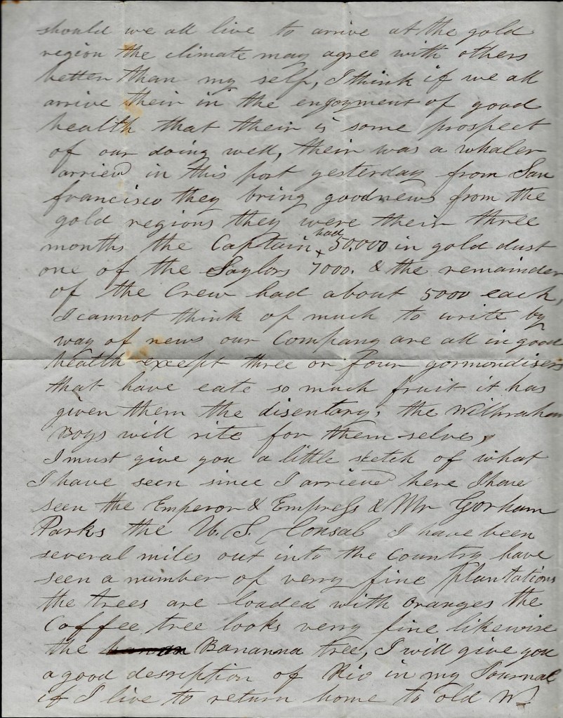 I must give you a little sketch of what I have seen since I arrived here. I have seen the Emperor & Empress & Mr. Gorham Parks, the U. S. Consul. I have been several miles out into the country, have seen a number of very fine plantations. The trees are loaded with oranges. The coffee tree looks very fine; likewise the banana trees. I will give you a good description of Rio in my Journal if I live to return home to old Wilbraham. Likewise of the natives & slaves. The poor slaves have a hard time of it. They are compelled to carry heavy burdens on their heads. They will take a barrel of flour & a large bag of coffee & run through the streets. I suppose there are more than a thousand persons in this harbor bound for the gold regions, but enough of this.