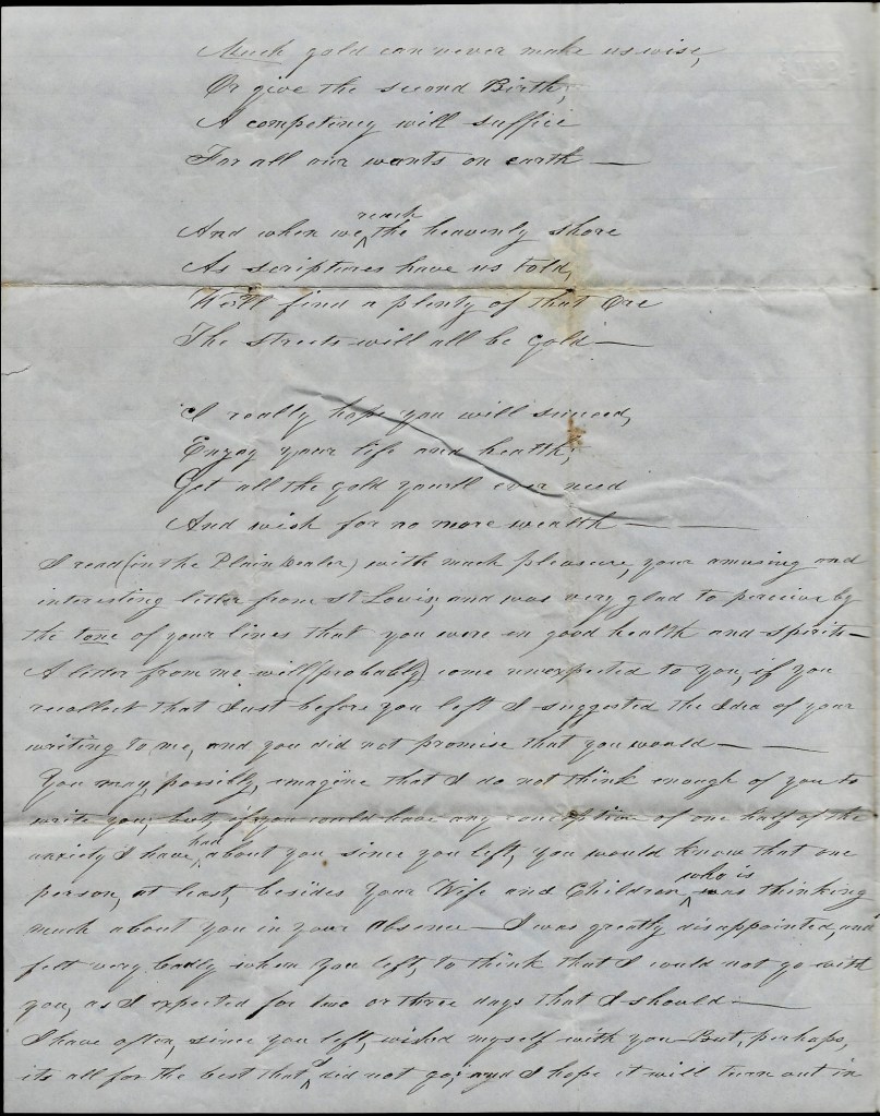 I read (in the Plain Dealer) with much pleasure your amusing and interesting letter from St. Louis; 1 and was very glad to perceive by the time of your lines that you were in good health and spirits. A letter from me will (probably) come unexpected to you, if you recollect that just before you left I suggested the idea of your writing to me, and you did not promise that you would. You may possibly imagine that I do not think enough of you to write you; but, if you would have any conception of one half of the anxiety I have had about you since you left, you would know that one person, at least, besides your wife and children was thinking much about you in your absence. I was greatly disappointed and felt very badly when you left to think that I could not go with you and expected for two or three days that I should. I have often, since you left, wished myself with you. But perhaps it’s all for the best that I did not go; and I hope it will turn out in the end to be for the best that you did go. If I was in as good situation as you are as respects property, I should not speak of going to California; but, a I was when you left, and am now poorer than Job ever was and out of business, I thought it best to try my luck. I think I would have stood the journey tolerably well and dug considerable gold when I got there; but probably it’s all hypothesis.