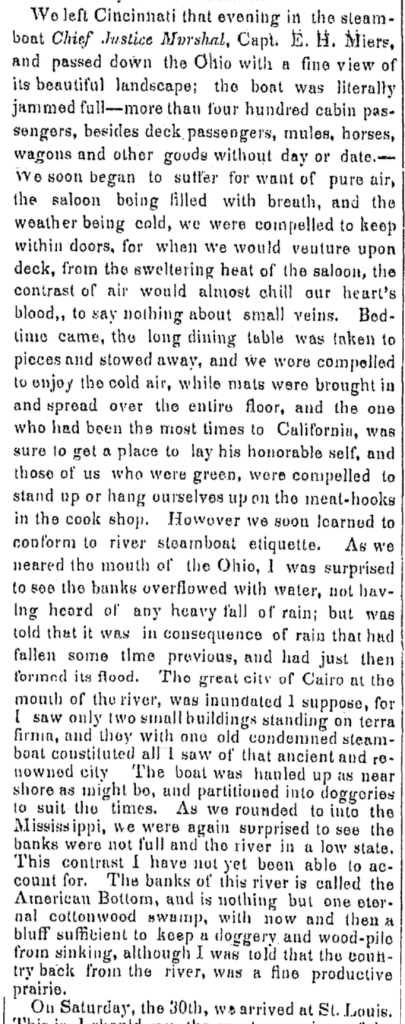 1 Though datelined from Independence, Missouri, on 15 April 1850, much of the following letter pertains to St. Louis, and I believe this is the letter to the editor of the Plain Dealer that Ira refers to. There are numerous letters appearing in that newspaper chronicling Benjamin Sawtell’s journey to California in 1850.