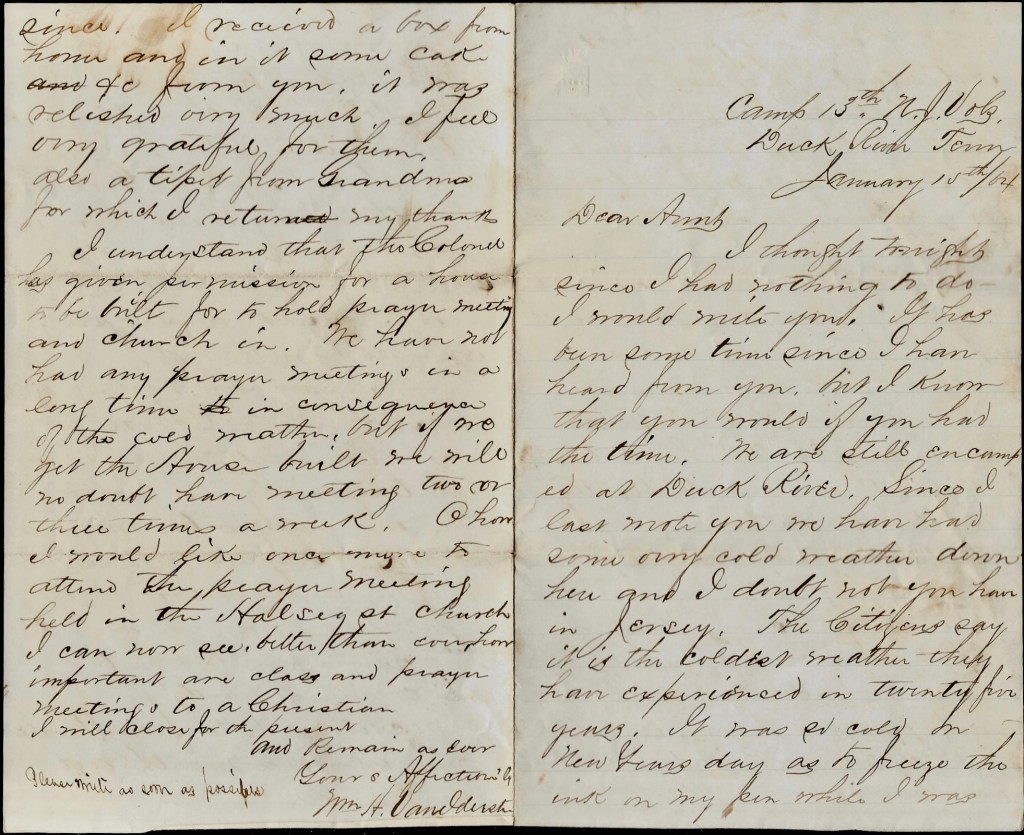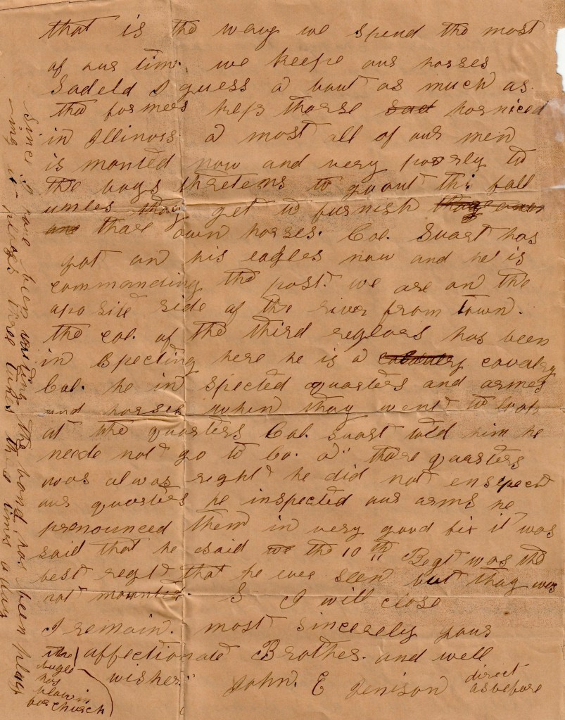 We are on the opposite side of the river from town. The Colonel of the Third Regulars has been inspecting here. He is a cavalry Colonel. He inspected quarters and arms and horses. When they went to to look at the quarters, Col. Stuart told him he need not go to Co. A [because] their quarters was always right & he did not inspect our quarters. He inspected our arms and pronounced them in very good fix. It was said that he said the 10th Regiment was the best regiment that he ever seen but they was not mounted.