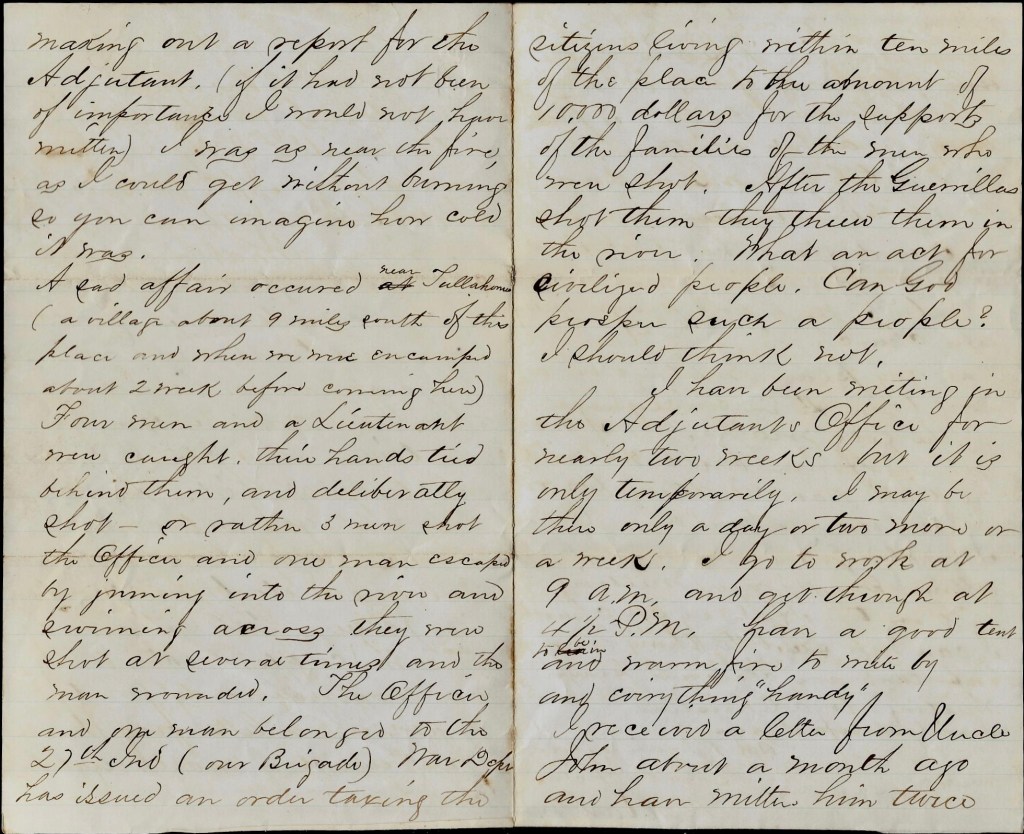 I traveled all day on the 4th and guarded prisoners at night. We started out on the second and was gone four days. Was ordered out again on the 8th. A good portion of the regiment went. I fixed to go and did not get my horse shod in time. They started in the morning that evening. I was called for a surprise scout. There was one lieutenant and twenty-two men of us. We started about dusk. We rode the most of the night. About ten the next day we ran afoul of a squad of guerrillas. We captured one and killed one. The one we killed shot ten times at us. We was mounted and he was afoot. We halted him and he would not stop. I and one other fired our carbines at him and he did not stop. We then three of us ran up onto him [and] he got behind a tree. All three of us fired at him and then I rode up [with]in about ten feet of him and demanded his arms. He said nothing but fired at me. He had before that fired some three or four shots at us. He fired one at me and I one at him when we was [with]in ten feet of each other. He shot a hole through my blouse sleeve. It knocked a piece of flesh off of my arm. By this time, I being on a very wild horse, the horse commenced jumping so I could not get a shot any more. The man next to me could not get his arms to go. The caps bursted. When he found out that his arms would not go, he got out as if there was a lot of varmints after him.