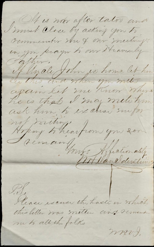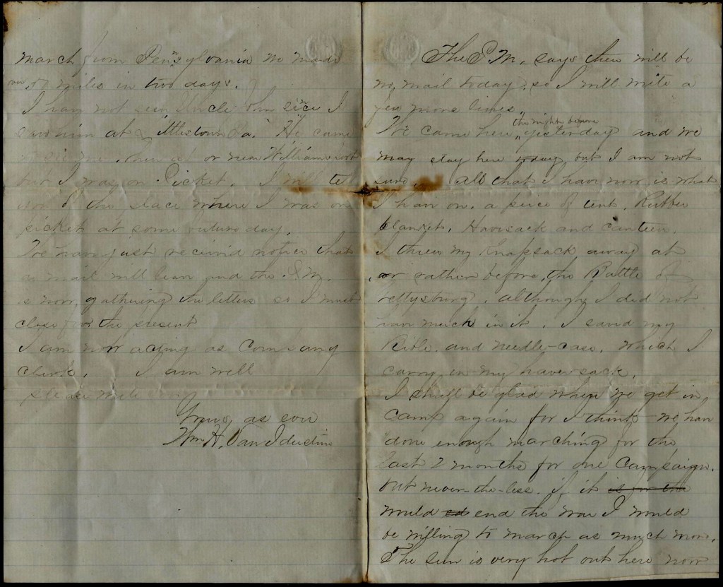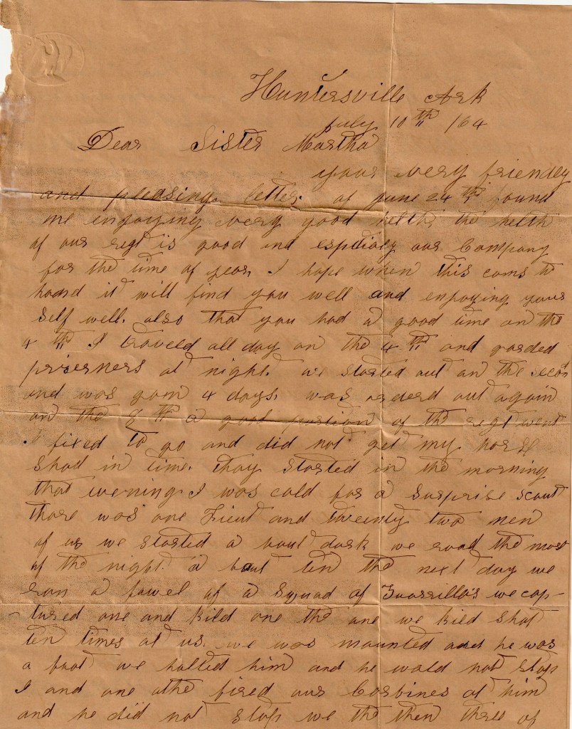In this letter, John gives his sister some details of the Skirmish at Huntersville which took place on 8 July 1864. When rebels guerrillas attempted to disrupt supply lines to the Union-occupied city of Little Rock, Col. James Stuart sent out a party of twenty enlisted men and one lieutenant to scout for guerrillas. In the brief engagement that followed, the Federals captured one enemy soldier and “killed or wounded four more” while not suffering any casualties of their own. The remaining Confederates escaped, and the Union troops did not pursue. John’s letter also speaks of the efforts by Joe Shelby to press into service men between the ages of 15 and 50 to participate on Price’s anticipated raid into Missouri later in 1864.