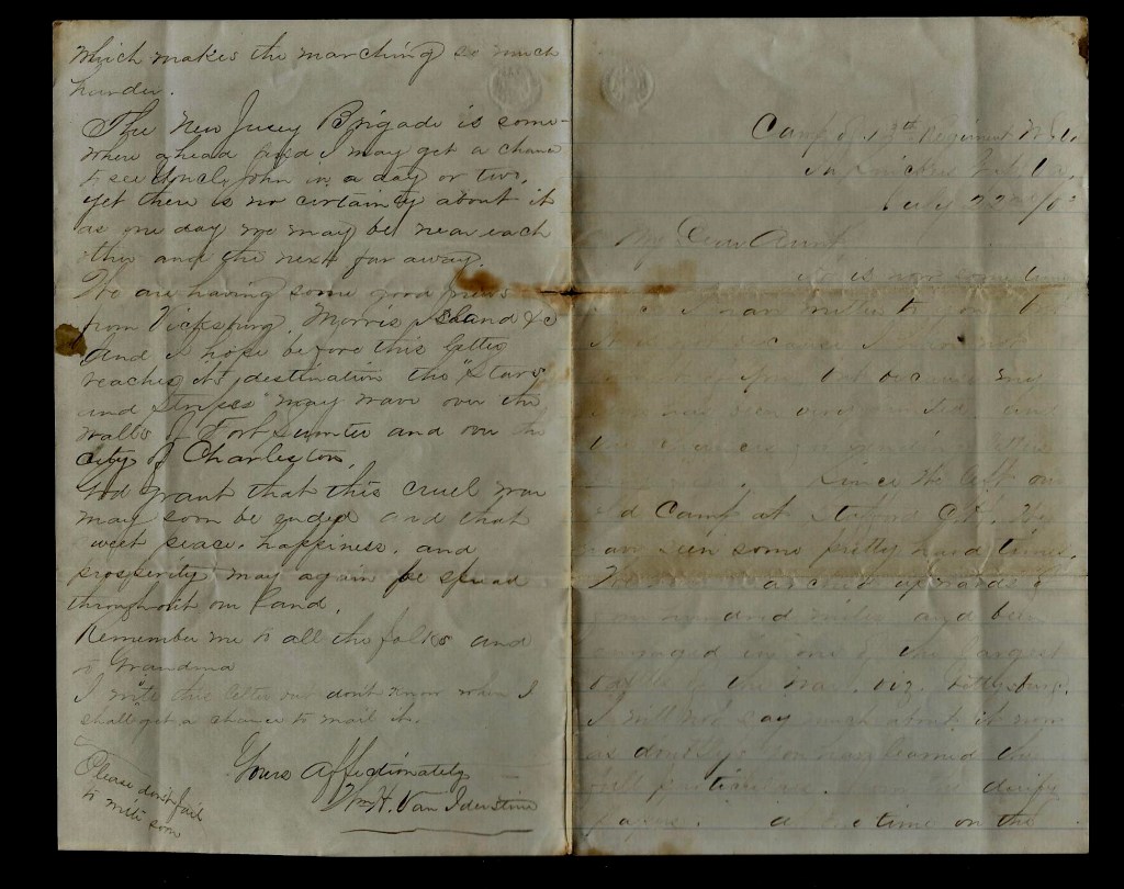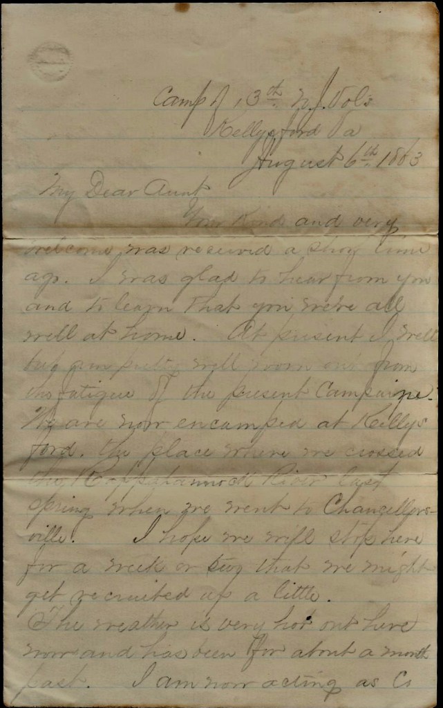 Your very friendly and pleasing letter of June 24th found me enjoying very good health. The health of our regiment is good and especially our company for the time of year. I hope when this comes to hand it will find you well and enjoying yourself well. Also that you had a good time on the 4th.