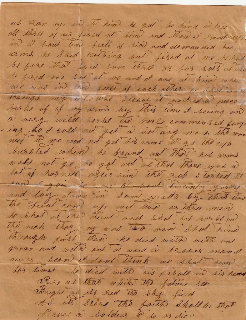 The reb started to run ahain. He ran about twenty yards and lay down in some weeds. By this time the lieutenant came up with two or three men. He shot at the lieutenant and shot his horse in the neck. There was two men shot him through just then. He died with one groan and without a word. A braver man I never seen, I don’t think. We shot him four times. He died with his pistol in his hand.
