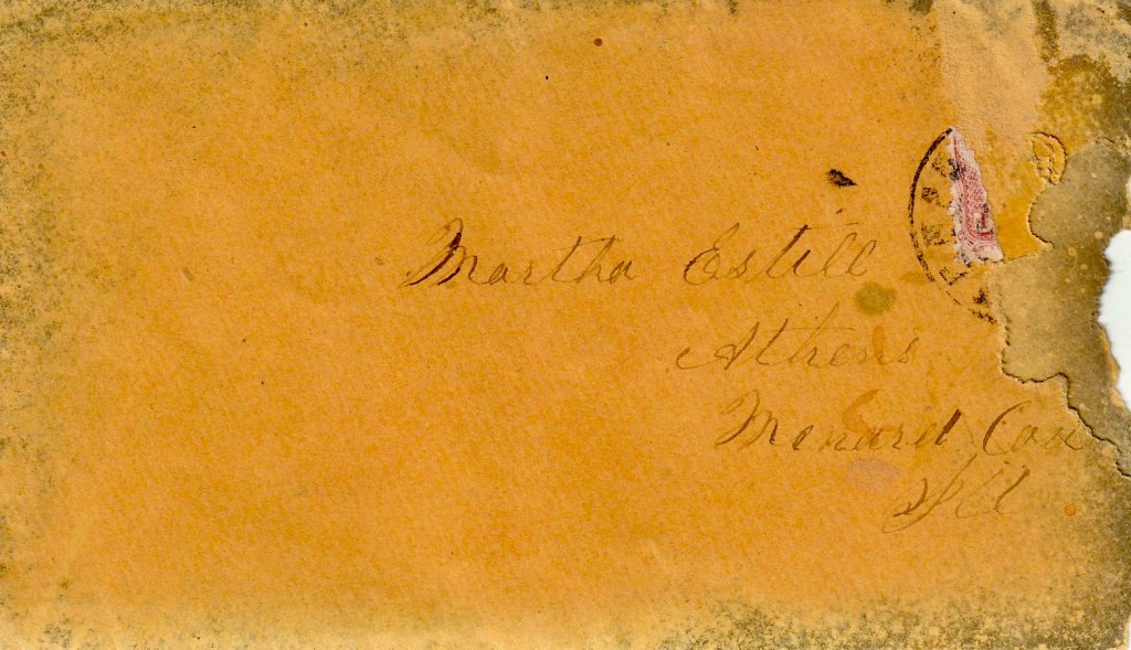The following letter was written by John Ewing Jenson (1839-1927), the orphaned son of John Singletary Jenison (1793-1853) and Martha McNabb (1804-1858) of Menard county, Illinois. He wrote the letter to his older sister, Martha (Jenison) Estill (1837-1866), the wife of Samuel Estill (1824-1900). After his parents died, John went to live with his older brother William “Luther” Jenison (1832-1905) of Greenview, Menard county.
