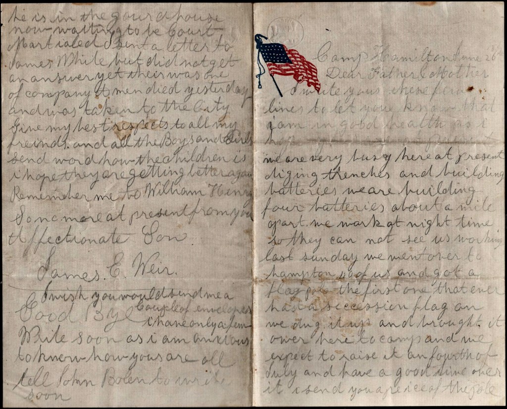 I sent a letter to James White but did not get an answer yet. There was one of Company A men died yesterday and was taken to the City. Give my best respects to all my friends and all the boys and girls. Send word how the children is. I hope they are getting better again. Remember me to William Henry. So no more at present. From your affectionate son, – James E. Weir
