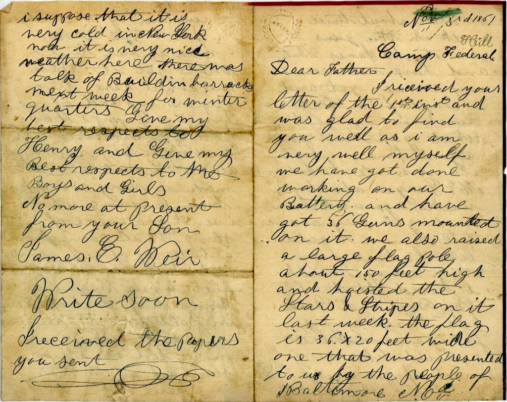 Give my best respects to all my friends and all the boys and girls, Remember me to the children and to William Henry. Tell Albert Buschman he must excuse me for not writing as we have been very busy ever since I received his, but I will write as soon as I get time. Sergeants [George E.] Hager and [Galbreath] Mathews send their best respects to you. When you write, direct your letter to Camp Federal Hill, Baltimore, instead of Camp Hamilton. No more at present. From your affectionate son, — James E. Weir