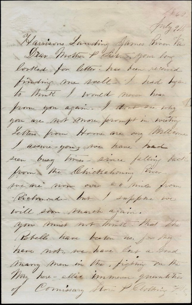 We have had some busy times since falling back fro the Chickahominy River. We are now over 20 miles from Richmond but I suppose we will soon march again. You must not think that the Rebels have beaten us for they have not. We have lost a good many men in the fighting on the way here. Also immense quantities of commissary stores & clothing, &c. We destroyed our bridges and a large portion of our pontoon train as we had not teams enough to draw it so we cut & burnt it. We expect to get another train while here.