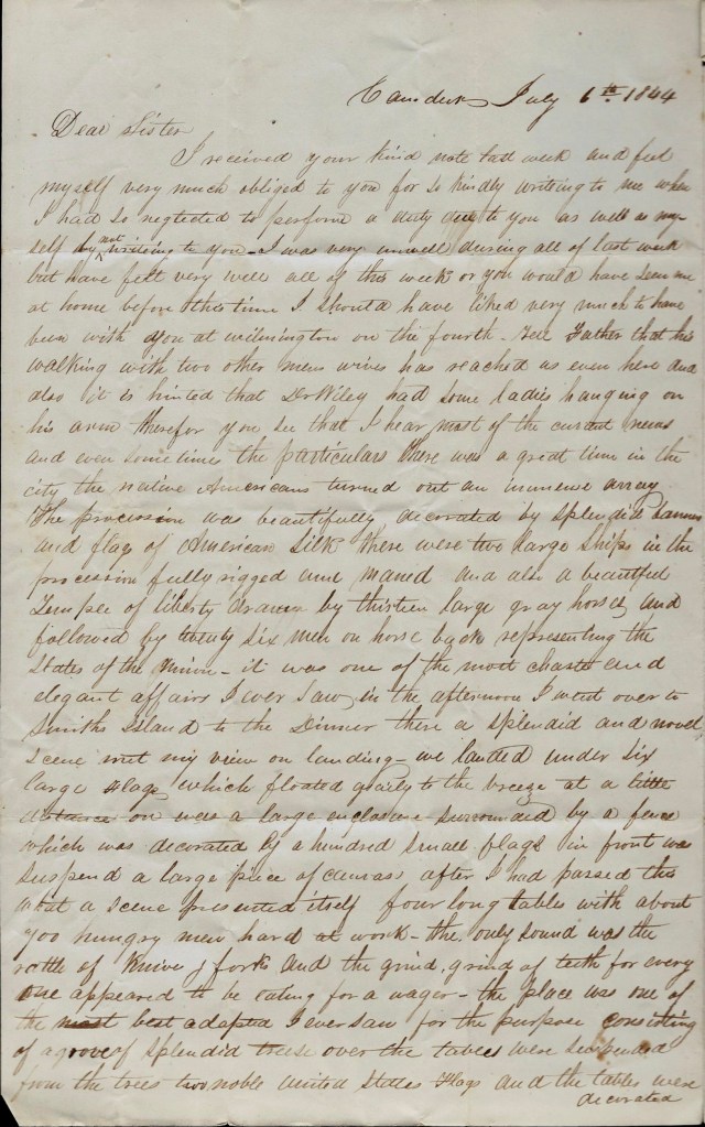 P. S. I dare not read this over, and, shall have you to correct the errors. I will endeavor to a more interesting next time, that after I receive one from you which I shall expect soon. I suppose you are freezing in New Hampshire yet. We have had it hot enough to “scorch a feather”—peach trees blossomed a week ago. We have pretty good living here—poultry a plenty of it, from turkeys down to robins, blue birds, and even yellow birds—four to the mouthful. Possums too brought into market every morning! Oh, I’ve left off chewing tobacco–[ ] today! and take but 3 glasses of ale a day! — H. S. M. F.