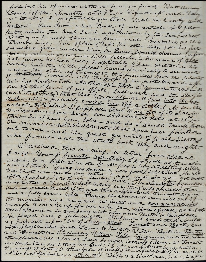 One of the Reps. the other day got his feet knocked from under him on Pennsylvania Avenue by an ungrateful little fellow by the name of alcohol whom he had very hospitably given shelter in his head, but the little rascal having a curiosity to see what was in the other extremes of the premises took the liberty of intruding himself into the props of his protector, and upset his corporation. Another one took a “round turn” with one of the jours. of our office last week and the story is (and it is true) that the honorable M. C. fell into the canal which probably cooled him off a little! As for the article of “balm”, I suppose there is no city of its size in the Union where such an extensive business is done at it as in this—so I have been told—and so I should think from the number [of] establishments that have been pointed out to me—and the great quantity of frail sisters who promenade the streets both day and night.