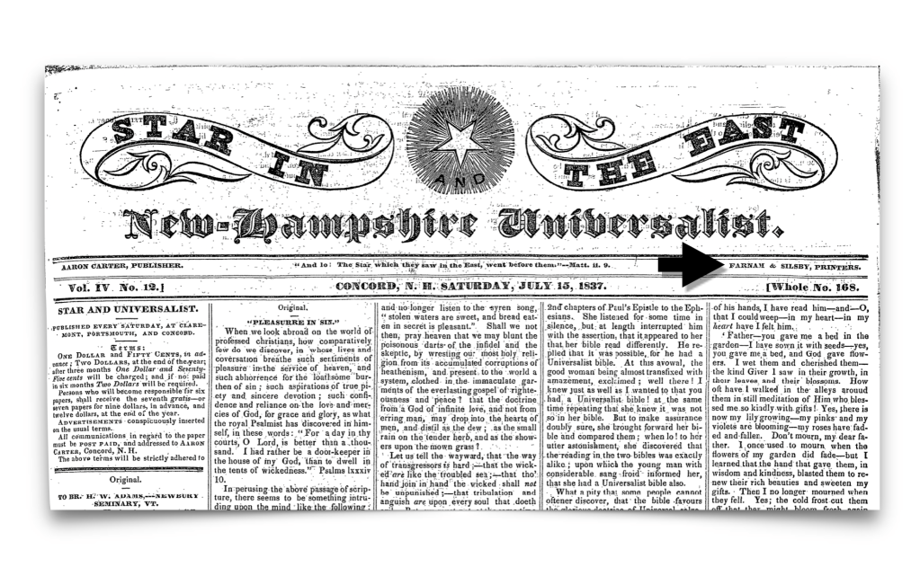 The following letter was written by Henry Simpson Mesinger Farnam (1815-1878), the son of Roger and Susan (Everett) Farnam of Attleboro, Massachusetts. Henry wrote the letter to his friend, George Henry Hough Silsby (1817-1892), the son of Ozias and Francis (Jones) Silsby of Hillsboro county, New Hampshire. We learn from the letter that Henry and George were former partners in the publication, “Star in the East“—a religious newspaper out of Concord, New Hampshire. The letter was written in the midst of the financial depression that occurred in 1837 so my assumption is that the newspaper failed as did many small businesses at that time.