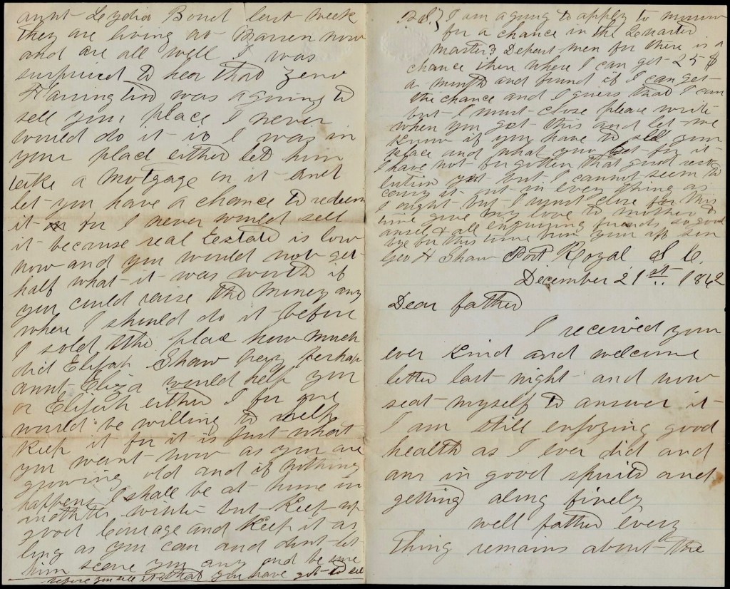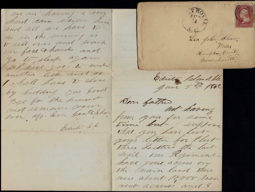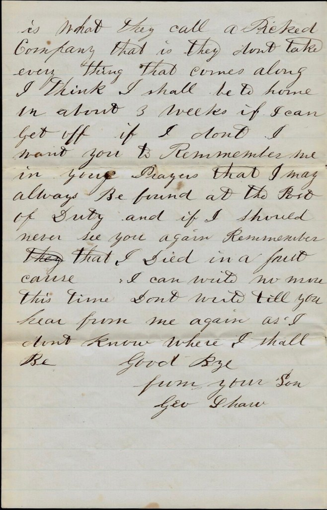 But one thing, Father, if I can’t get a chance to come home, you must come down here and stop at Jim’s and all hands come down. But I think that I can get home if you work as I told you. So goodbye for this time. Give my love to Mother and Ellen John and Ansel, and keep a large share for yourself. Hoping to hear from you soon, I remain your ever affectionate son, — George H. Shaw