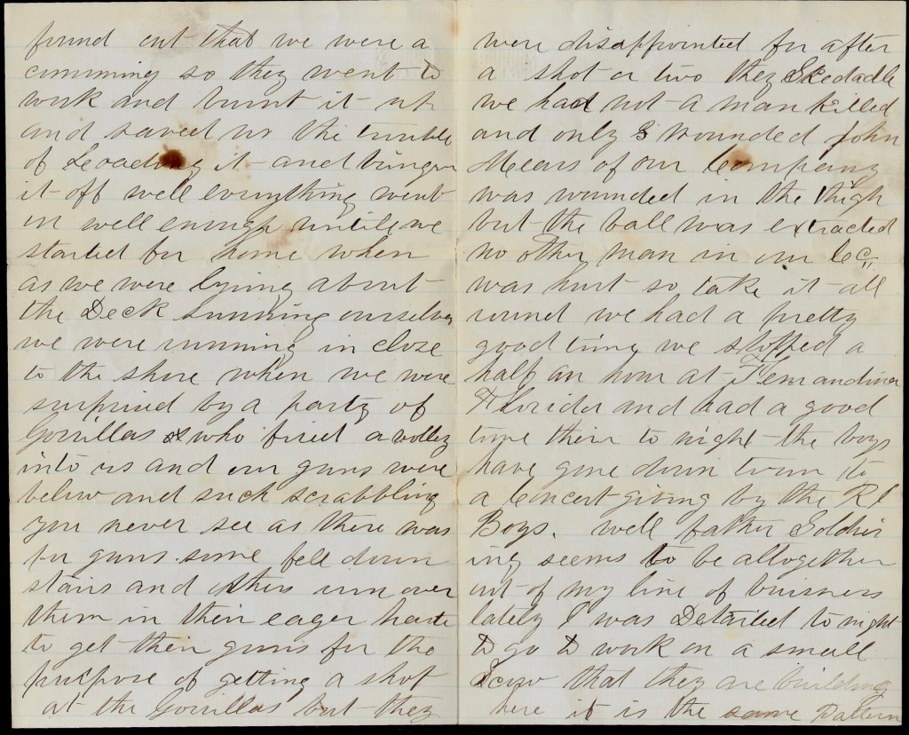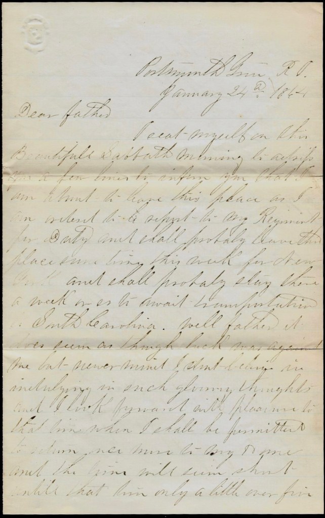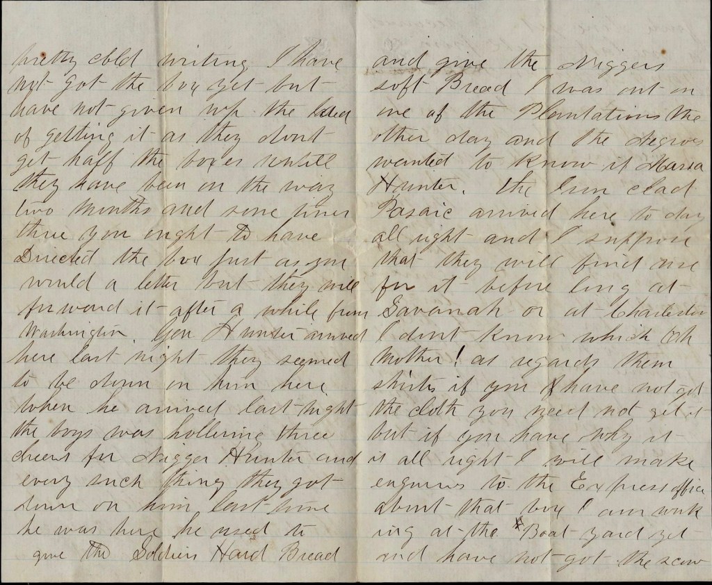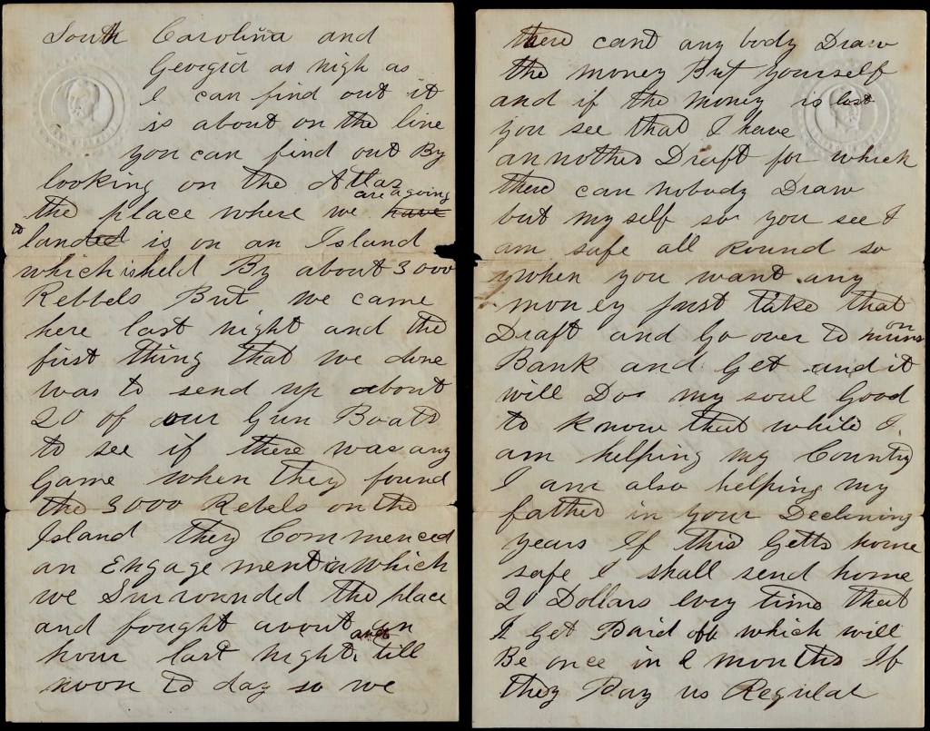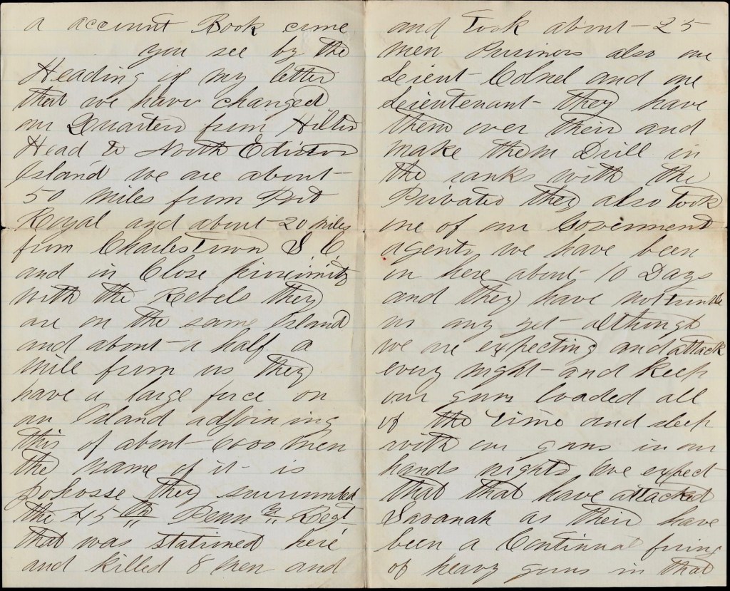 You will see by the heading of this letter that we are on the move again and I suppose that they are a going to try Charleston once more for there is 4 or 5 monitors here and they say that there is heavy reinforcements laying in and around Charleston Harbor and under the command of Gen. [ ]. We left Hilton Head on the 19th April and arrived here on the night of the 20th and we are laying off in the river awaiting orders and I don’t know whether we shall land here or not. I hear it talked here a good deal that we—that is, this Brigade—will make a strike on the Charleston & Savannah Railroad somewhere in the neighborhood of Adams Run to stop reinforcements coming from Savannah but I don’t think they know anything about it. One thing I do know, that is we have got to endure a pretty tedious march now till we get into Charleston and fight our way too.
