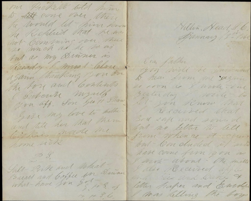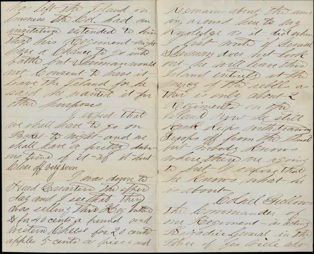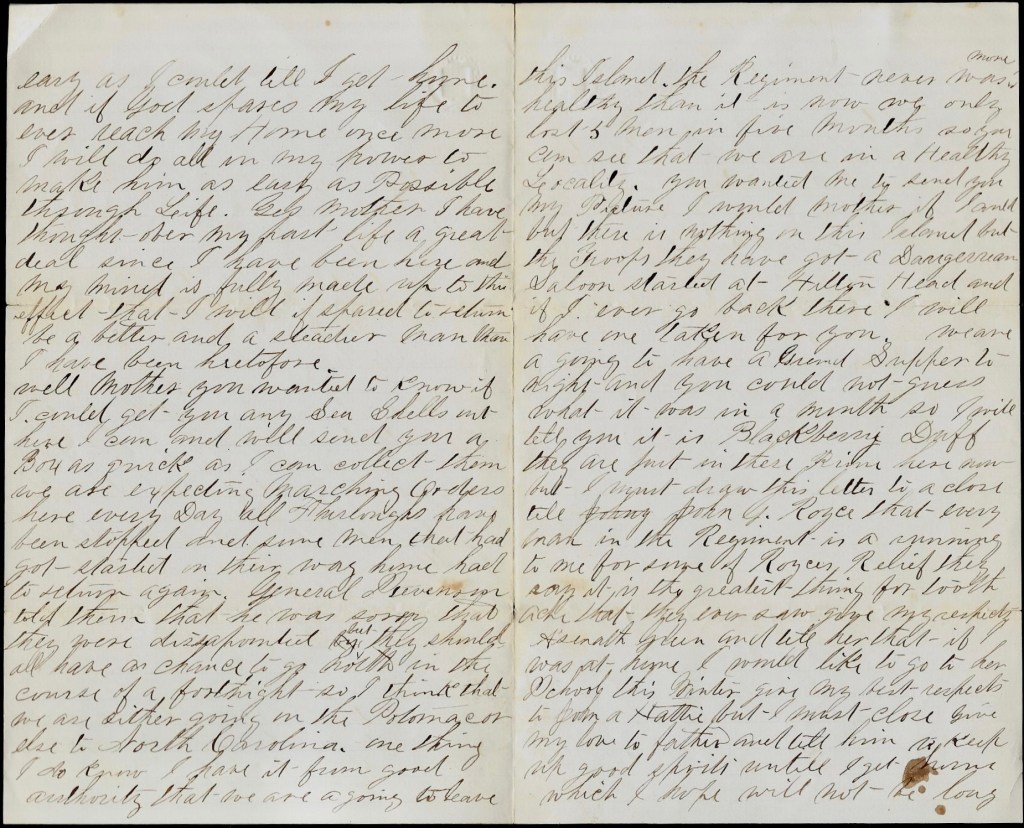 The regiment never was more healthy than it is now. We only lost 5 men in five months so you can see that we are in a healthy locality. You wanted me to send you my picture. I would, mother, if I could but there is nothing on this island but the troops. They have got a daguerrian salon started at Hilton Head and if I ever go back there, I will have one taken for you. We are a going to have a grand supper tonight and you could not guess what it was in a month so I will tell you. It is Blackberry Duff [steamed pudding].