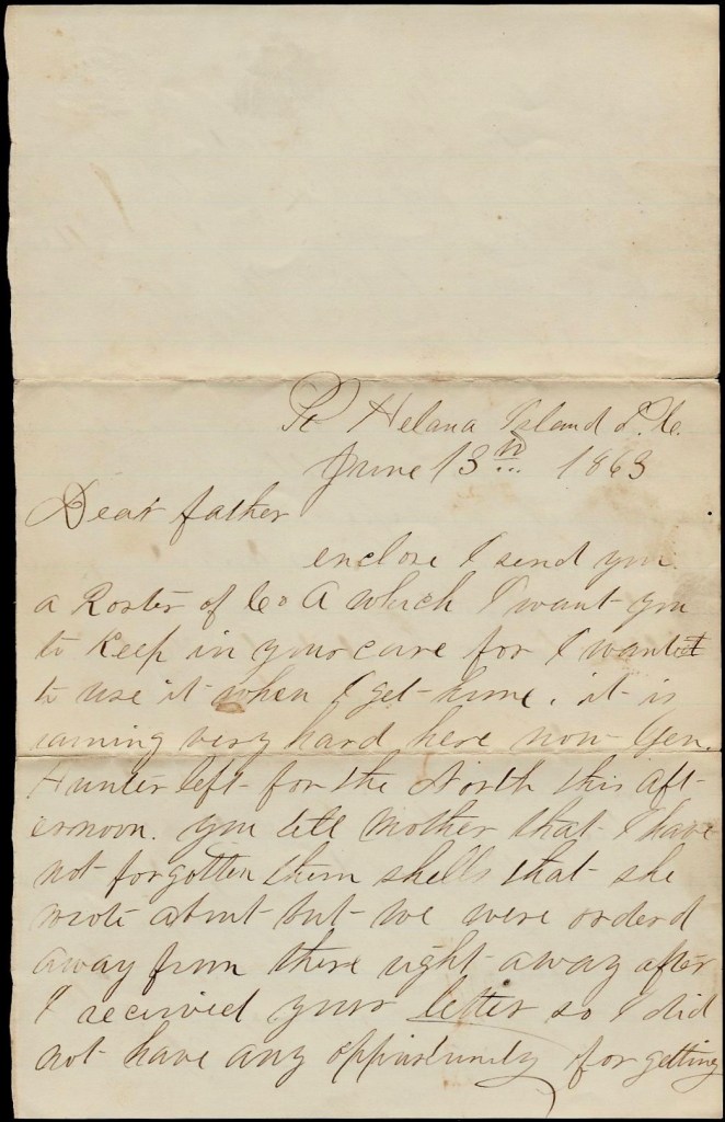 Enclose I send you a roster of Co. A which I want you to keep in your care for I want to use it when I get home. It is raining very hard here now. General Hunter left for the North this afternoon. you tell Mother that I have not forgotten them shells that she wrote about but we were ordered away from there right away after I received your letter so I did not have any opportunity for getting them but will do so at the first opportunity. I have got two splendid shells now which I will send in a paper along with this letter.