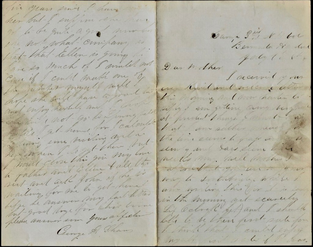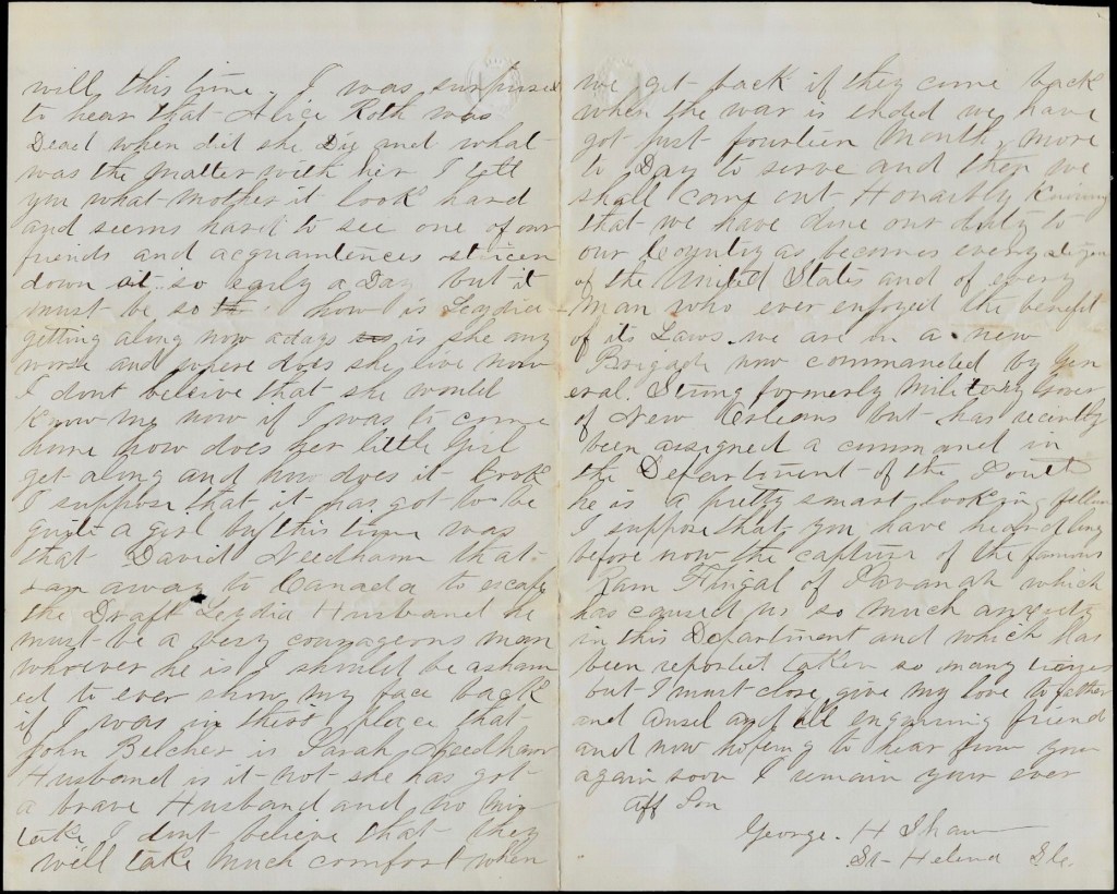 But I must close. Give my love to John & Harriet and Mother and all of the rest. And don’t forget to take a large share yourself. So goodbye for this time. So hoping to hear from you soon, I remain your ever affectionate son — George H. Shaw