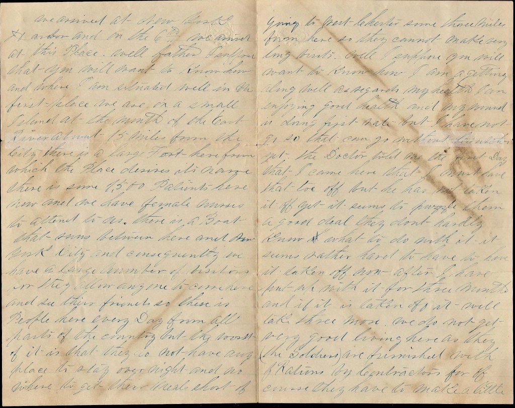 Well, Father, I suppose that you will want to know how and where I am situated. Well in the first place we are on a small island at the mouth of the East River almost 15 miles from the city. There is a large fort here from which the place derives its name. There is some 1,500 patients here now and we have female nurses to attend to us. There is a boat that runs between here and New York City and consequently we have a large number of visitors for they allow anyone to come here and see their friends so there is people here every day from all parts of the country. But the worst of it is that they do not have any place to stay over night and no where to get their meals short of going to West Chester some three miles from here so they cannot make very long visits.