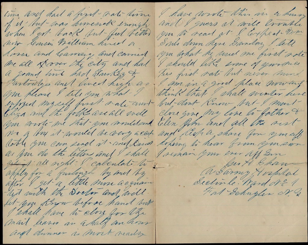 I tell you what it is, Father. The luck seems to be against me somehow or other for if I had not left Fort Schuyler, I would have been home this month and now things look dark again for they are a great deal more strict here than it was at Fort Schuyler. But I think that I shall like it better than I did there. I calculate to get on the right side of the doctor so that he will give me a chance, if there is one, for you have to be recommended by the Surgeon in charge of ward before you can get a pass and in order to get a furlough you have to get a paper from your parents stating that it is a case of extreme necessity and have it signed by the Selectman of the place and Justice of the Peace. So if you want me to come home, you can get up one of them papers as I. have told you and I don’t think there would be any trouble in my getting one.