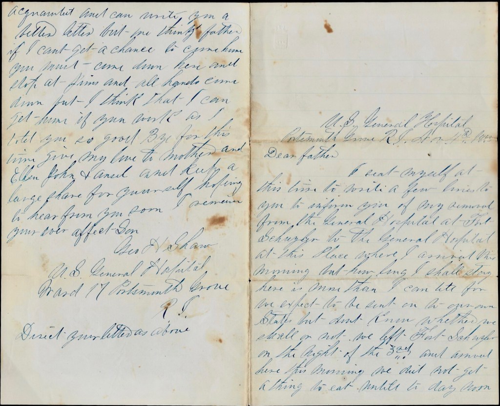 I hear that the Rebels have retaken Plymouth, North Carolina, but do not know whether it is so or not. Well, I shall have to think about drawing this letter to a close for I have got some work to do yet tonight. Give my love to Mother and John, Ellen, and all of the rest. I shall write you every opportunity that I get which may be often and may not for it depends altogether on how we are situated. Love to all, hoping to hear from you soon, I remain your ever affectionate son, — George H. Shaw