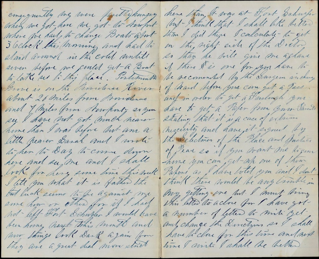 I seat myself at this time to write a few lines to you to inform you. of my removal from the General. Hospital at Fort Schuyler to the General Hospital at this place where I arrived this morning. But how long I shall stay here is more than I can tell for we expect to be sent on to our own states but don’ know whether we shall or not. We left Fort Schuyler on the night of the 3rd and arrived here this morning. We did not get a thing to eat until today noon, consequently we were pretty hungry when we got here. We got to Newport where we had to change boats about 3 o’clock this morning and had to stand around in the cold until seven before we could get a boat to take us to this place.