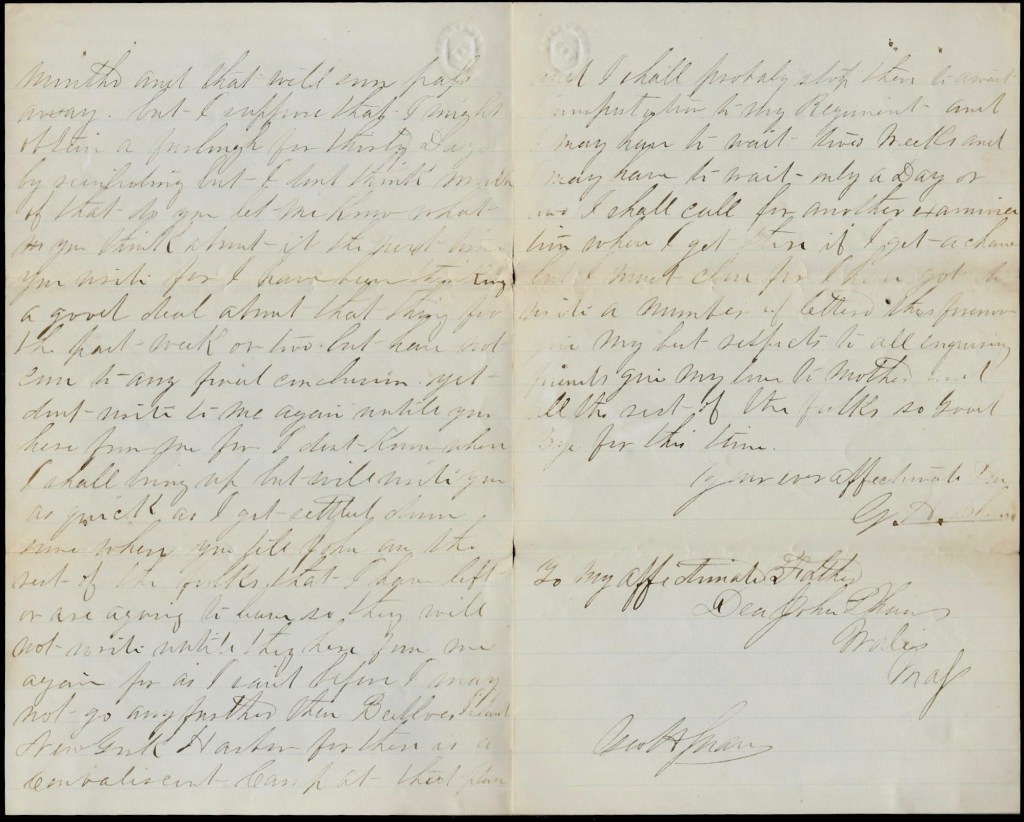 Well, Father, it does seem as though lick was against me but never mind, I don’t believe in indulging in such gloomy thoughts and I look forward with pleasure to that time when I shall be permitted to return once more to my home and the time will seem short until that time—only a little over five months and that will soon pass away. But I suppose that I might obtain a furlough for thirty days by reenlisting but I don’t think much of that, do you? Let me know what you think about it the next time you write for I have been thinking a good deal about that thing for the past week or two but have not come to any final conclusion yet. Don’t write to me again until you hear from me for I don’t know when I shall bring up but will write you as quick as I get settled down somewhere. You Tell John and the rest of the folks that I have left or are a going to leave so they will not write until they hear from me again for as I said before, I may not go any further than Bedloe’s Island, New York Harbor for there is a Convalescent Camp at that place and I shall probably stop there to await transportation to my regiment and may have to wait two weeks and may have to wait only a day or two.