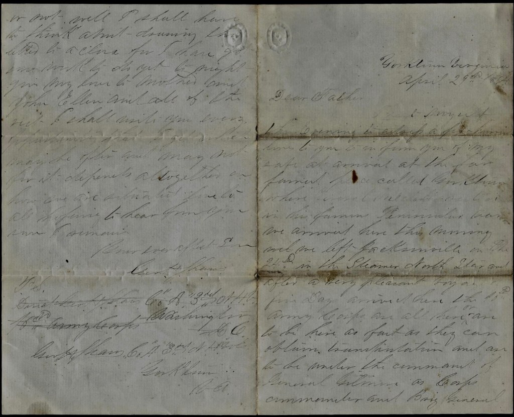I seat myself this evening to address a few lines to you to inform you of my safe arrival at the far famed place called Yorktown where General McClellan visited in his famous Peninsular war. We arrived here this morning. We left Jackson Ville on the 24th in the steamer North Star and after a very pleasant voyage of five days, arrived here. The 10th Army Corps are all here, or are to be here, as fast as they can obtain transportation and are to be under the command of General Gilmore as Corps commander and Brig. General Alfred Terry as Division commander and Col. Hall as Brigade commander. And we are getting ready as fas as possible for the coming spring campaign.