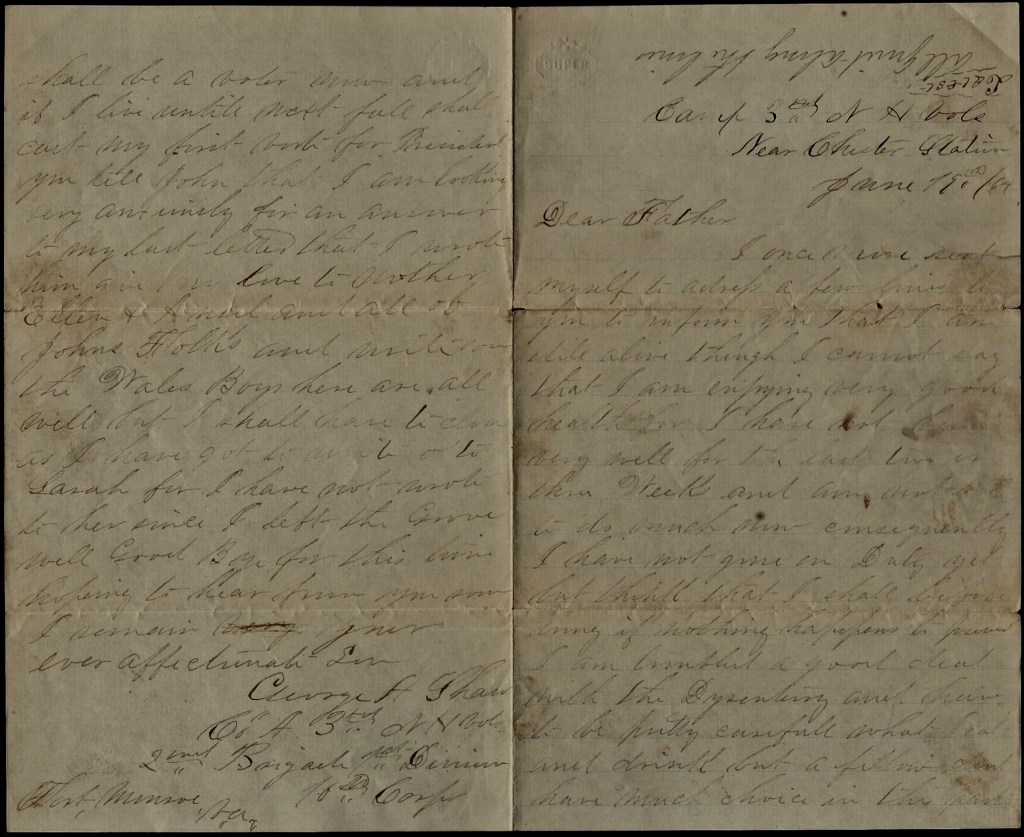 Has John received my letter yet that I wrote almost a week ago? By the way, Father, you must look after Mother a little when she directs my letters for I see that the last that I got was directed to the 16th Army Corps instead of the 10th but as luck would have it, I received it so it is all the same now, only I might not get it another time. But I suppose the reason that they know where to send it was on account of the regiment being on it (and they all know where the fighting kind is). But I must close. Give my love to Mother and John and his folks and all enquiring friends and now goodbye for this time. Hoping to hear from you again soon, I remain your ever affectionate son, George H. Shaw