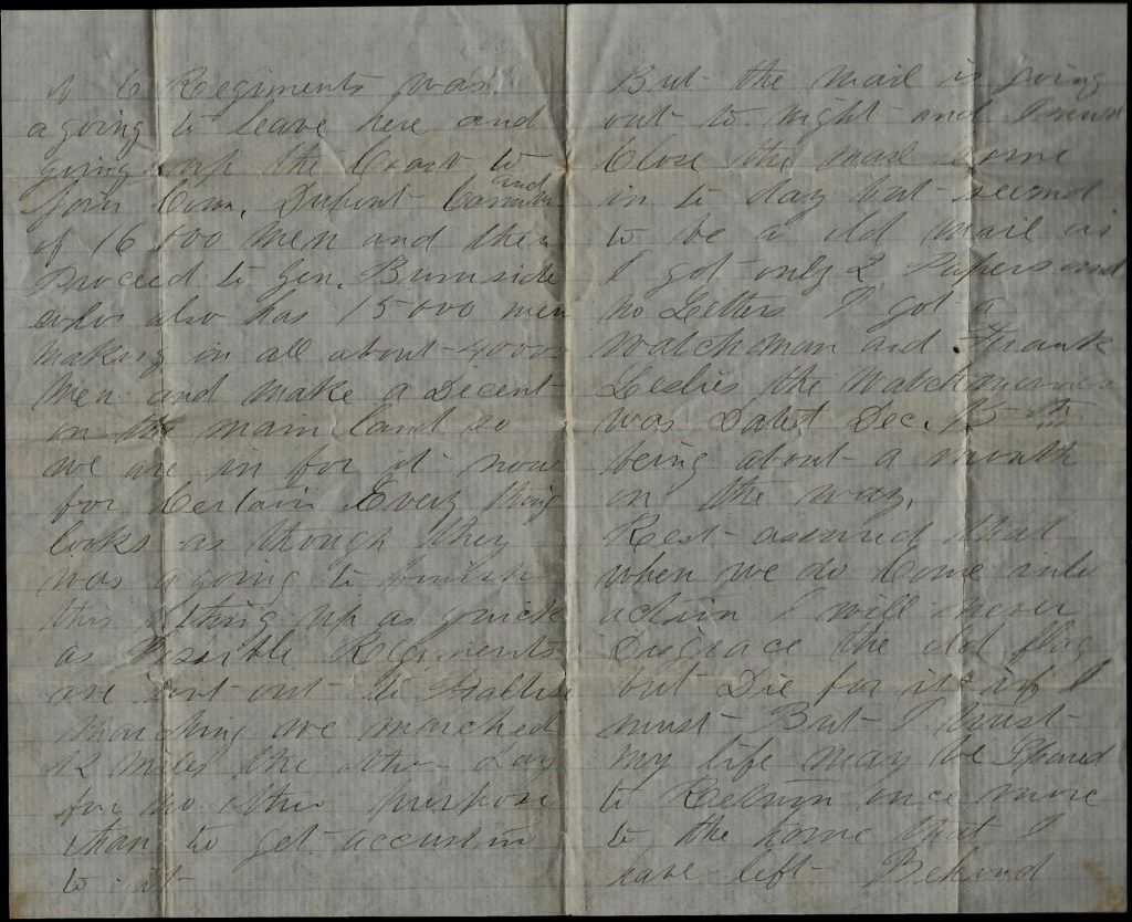 I received your letter dated Exeter, Nov 30th, last night and take the first opportunity to answer it. Those money letters are all accounted for except one with $10 in it and $15 which I sent to Mary by Express. Two letters I sent from Fortress Monroe, each containing five dollars, and directed to Oxford. The next two were written on the Steamer Atlantic, directed to Bradford, $10 in one and $20 in the other, and put in the [Post] Office before we landed. Then after we had got ashore, I got a letter from you written at Orford so I found out you had not returned to Bradford. (and the next two money letters were directed to /this is a mistake, one letter instead of two/ Orford each containing $10. I don’t remember the dates but they were both written after we landed and before the 20th of November. The fifteen dollars I sent by Express was given to the Chaplain on the 20th November and he said a receipt for it would be sent back from Fortress Monroe soon as they could have time to make them out and a boat was coming this way. This receipt is given so that in case the money is lost we can have something to show that we have sent it and the company makes it good. But I have not seen the receipt or heard from the money yet.