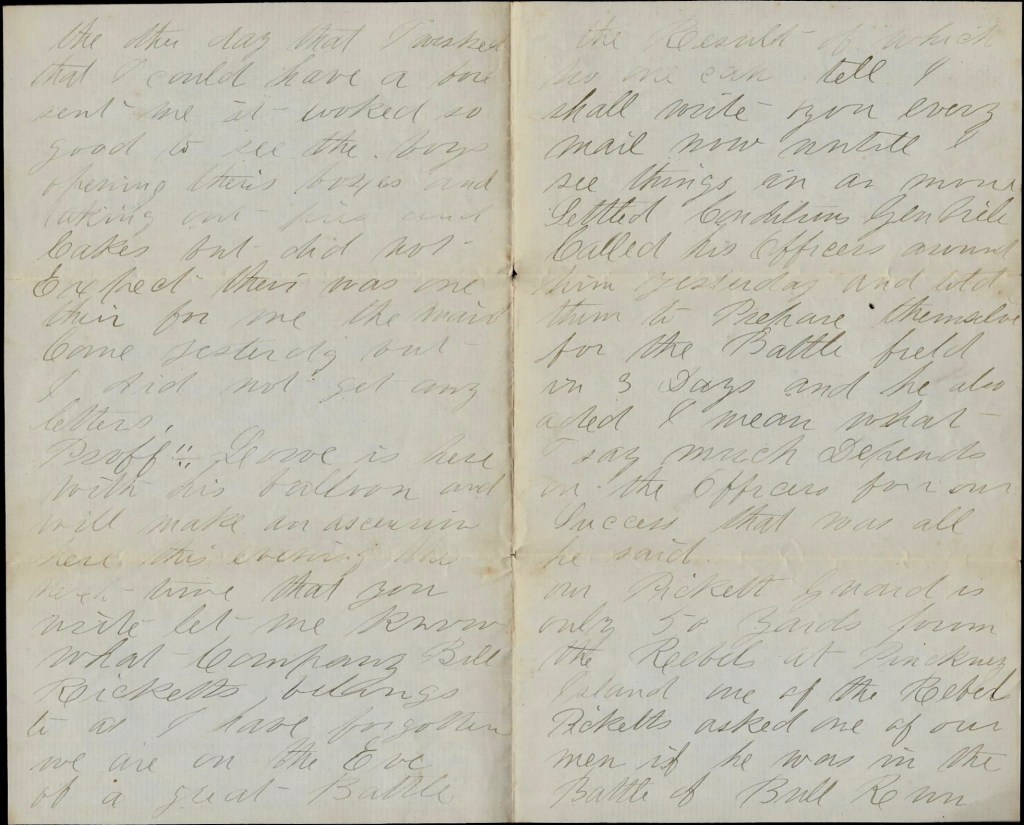 There is nothing new of any importance going on here—only an occasional firing between the pickets and not much harm done on either side. We were expecting and attack here last night for Jeff Davis said that he would astonish the whole world on the 4th of July and we did not know but what he might take that way to have done it but I am afraid that if he had, he would have the astonished party for we was fully prepared to receive him.