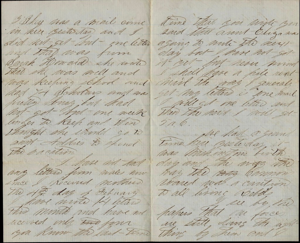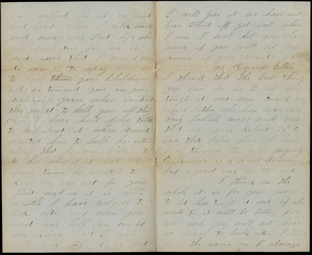 I received your ever kind and welcome letter of the 14th instant last night. I am still enjoying the blessing of life and health, and I hope that this will find you the same. I was sorry to hear that Father’s health was so poor but I hope that it will be better soon. I should think that he would keep out of the mill for he must know that he cannot always work in there. He is getting too old to work in the mill but it he must, why don’t he stay out summers and work winters. If I was in his place, I would get along as early as I could till. I get home and if God spares my life to ever reach my home once more, I will do all in my power to make him as last as possible through life.