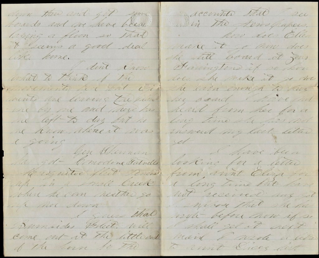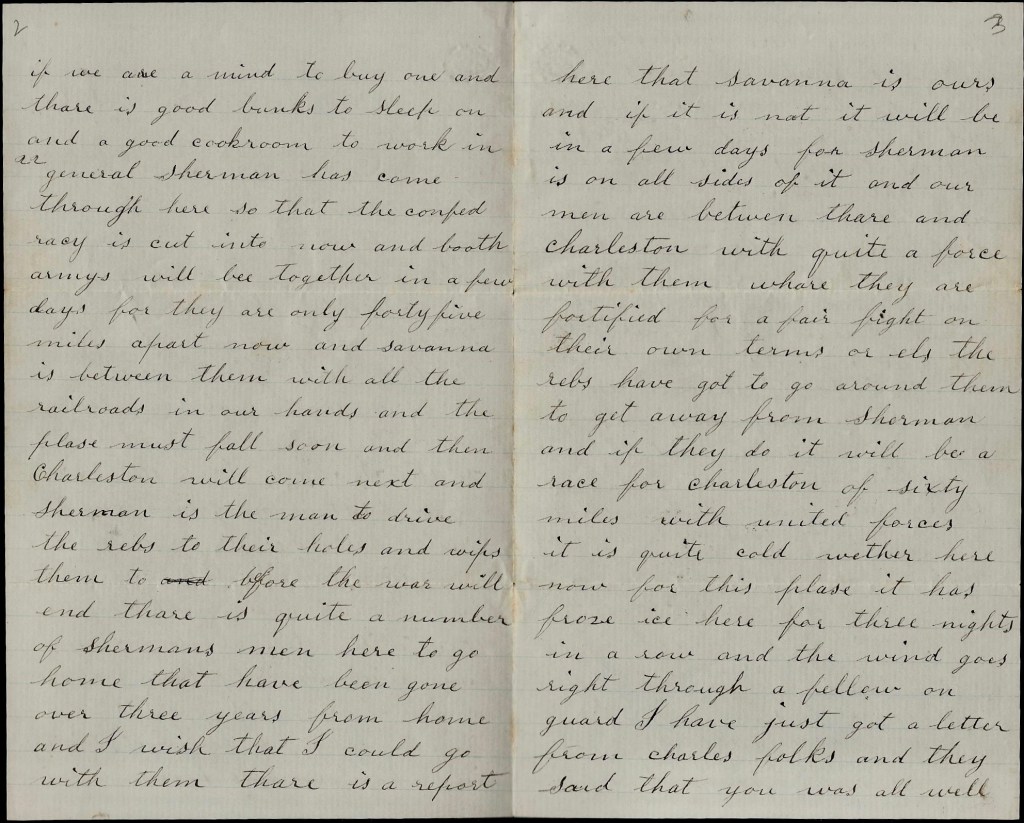 General Sherman has come through here so that the Confederacy is cut in two now and both army’s will be together in a few days for they are only forty-five miles apart now and Savannah is between them with all the railroads in our hands and the place must fall soon, and then Charleston will come next, and Sherman is the man to drive the Rebs to their holes and whip them too before the war will end. There is quite a number of Sherman’s men here to go home that have been gone over three years from home and I wish that I could go with them.