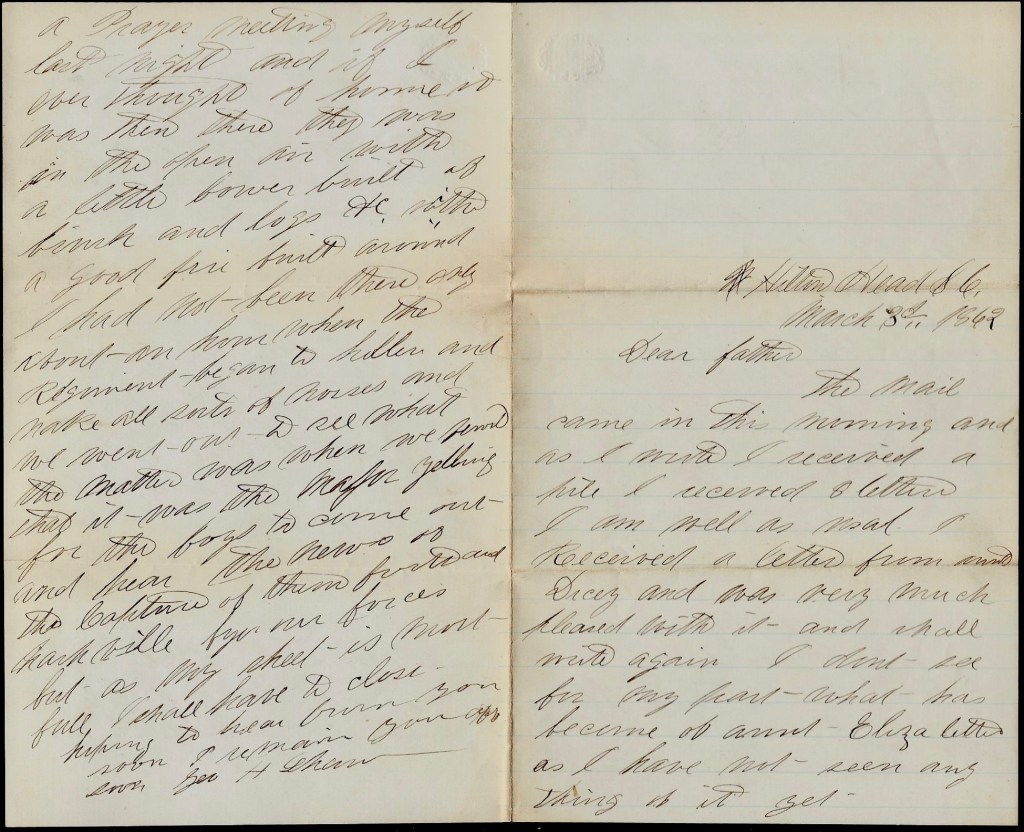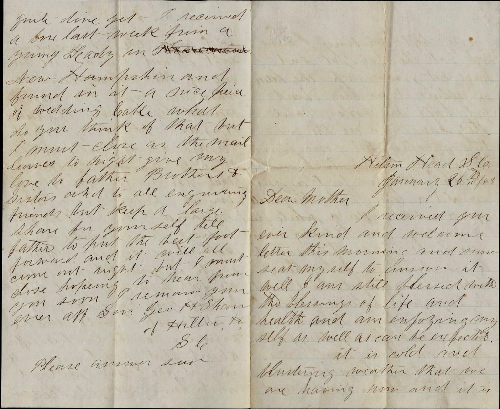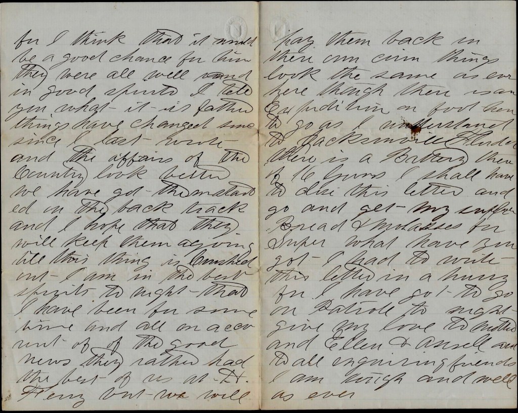 Well, I got a letter from you yesterday and was glad to hear that you and yours are well and hope that you will remain well till I get home again all right. There was some United States troops here yesterday that expected to stay and got all of their things in the yard and then was ordered to Florida and left before night again and when there will be others come, we don’t know, but am in hopes it will be soon. There is every sort of rumor here as well as there about our going home soon. I have not heard from James nor Gilbert since I last wrote to you for it is about sixty-five miles from here to Charleston and we don’t have to go there since Johnston surrendered. There is no more soldiers going to their regiments, but go to New York instead of coming from there here, but it is all the other way and I am glad of it for my part so that some can get home [even] if I can’t. But our turn will come by & by, I think, for there is a good deal of talk about going and I think we shall come between this and July. There is some a going on this boat that are unable to do anything here.