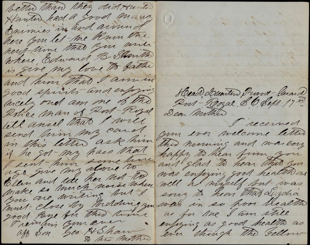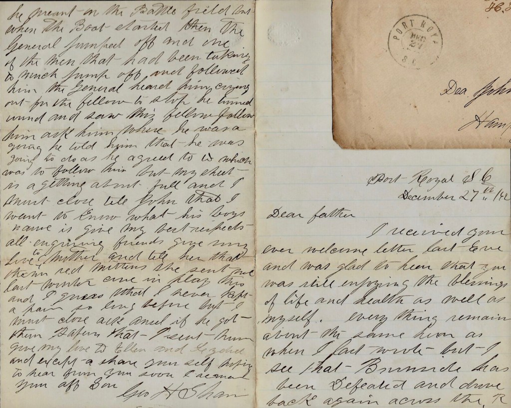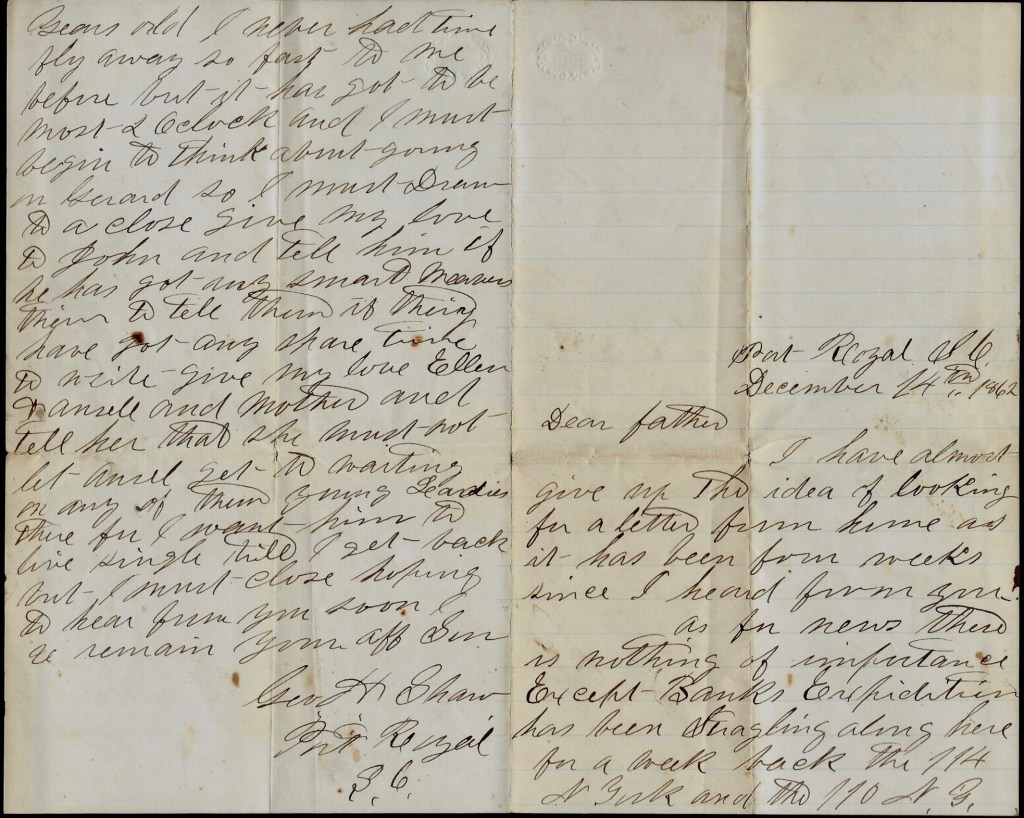 I suppose that you have heard long before now the capture of the famous Ram Fingal of Savannah which has caused us so much anxiety in this department and which has been reported taken so many times. But I must close. Give my love to Father and Ansel and all enquiring friend and now, hoping to hear from you again soon, I remain your ever affectionate son, — George H. Shaw, St. Helena Island