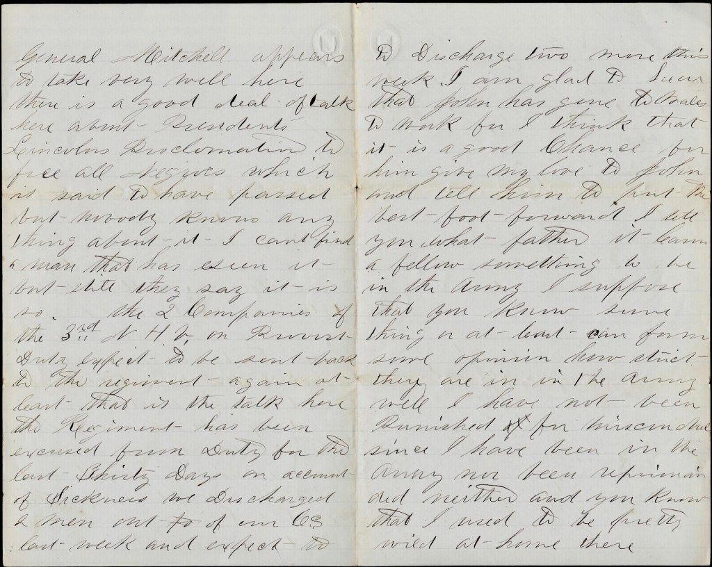 It is with pleasure that I write to you to let you know that I am in the land of the living, and have tolerable good health at this time, and hope you are the same. You spoke in your letter that you had got some things to take care of and a garden to hoe, and how do you get along with it? And have you any chickens to eat this fall? And [you said] that you had rather hear that I was killed in battle than to hear that I was under arrest. Now I had rather serve my time out in some fort than be in this aristocratical army for it gets worse every day for we have got to have everything scoured and polished til you can see your [face] in it. And the Rebs can see our guns glisten as far as they can see us, and they know right where to shoot, and we can’t see them—only by their smoke—and we can’t sight our guns for they glisten so that it hurts our eyes and draws the sun so that we are getting sun struck when we ought to be the best, and then have to retreat to save ourselves and sick. There is as many again die here as gets killed in battle on that account and that is the reason we get sick of it. And the officers put on airs and strut about and find fault with the men and punish them for nothing, but when it goes to a court martial, then they are done for.