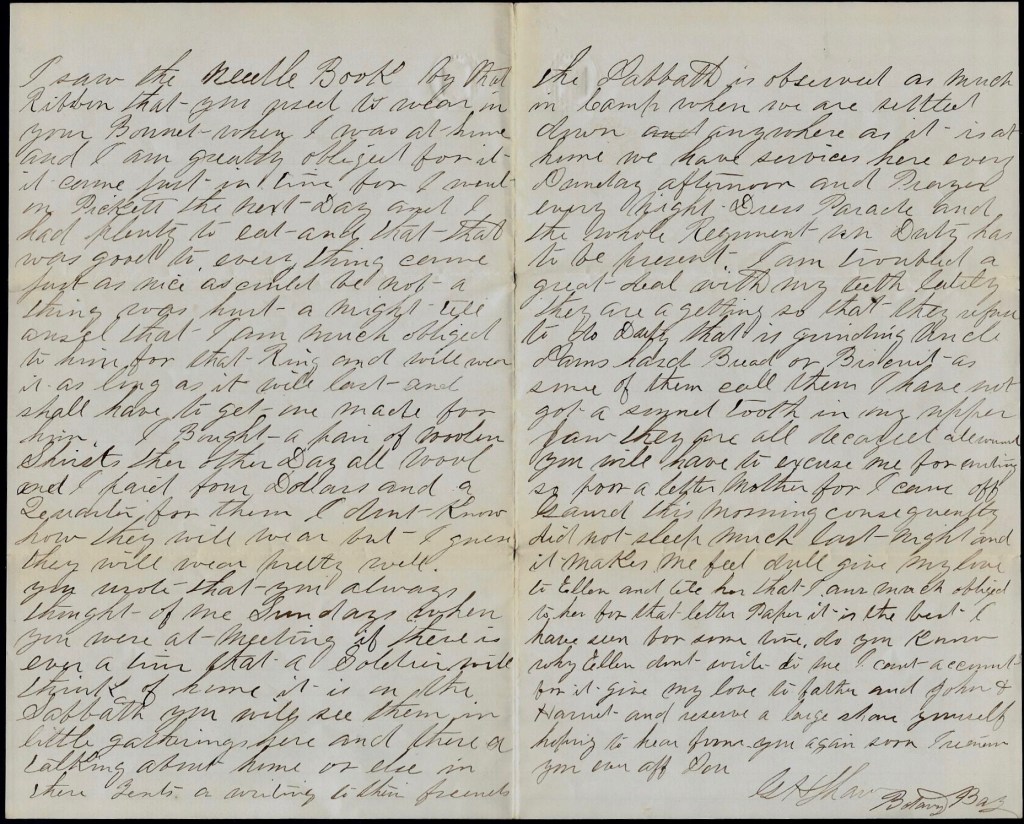You will. have to excuse me for writing so poor a letter, Mother, for I came off guard this morning, consequently did not sleep much last night and it makes me feel dull. Give my love to Ellen and tell her that I am much obliged to her for that letter paper, It is the best I have seen for some time. Do you know why Ellen don’t write to me? I can’t account for it. Give my love to Father and John & Harriet and reserve a large share yourself. Hoping to hear from you again soon, I remain your ever affectionate son, — George H. Shaw