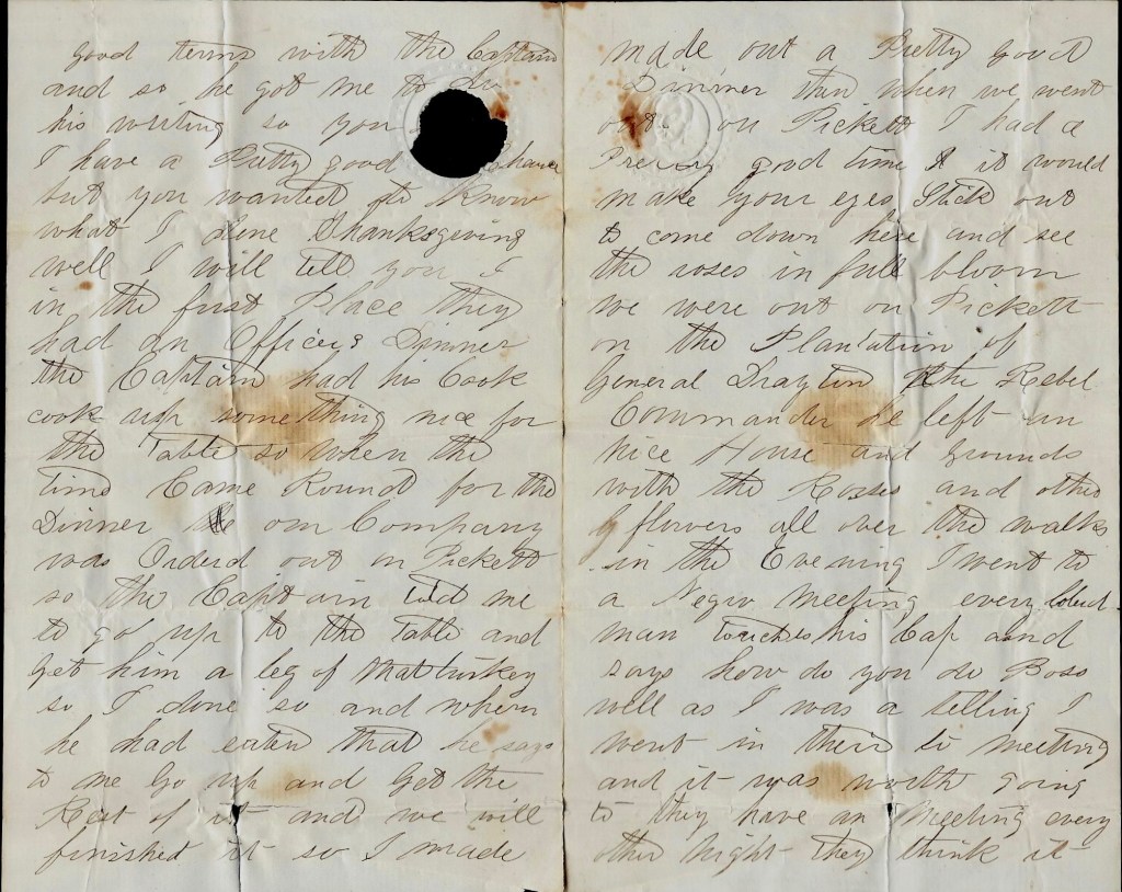 Tuesday morning and I have just come off picket and it was rather cold in the night for this place, but I got warm as soon as I heard that there was a letter here for me, and I got it before I unharnessed myself and read it, and it was a joy to hear that you was all well at that date. But you didn’t say anything about James’s folks nor Gilbert’s, and I guess you had better next time for I want to know what [they] think of being alone this winter. And I should like to know which is the loneliness of you all and how you get along. And tell Jeremiah that he must do the best that he can for the widows that are left to his care.