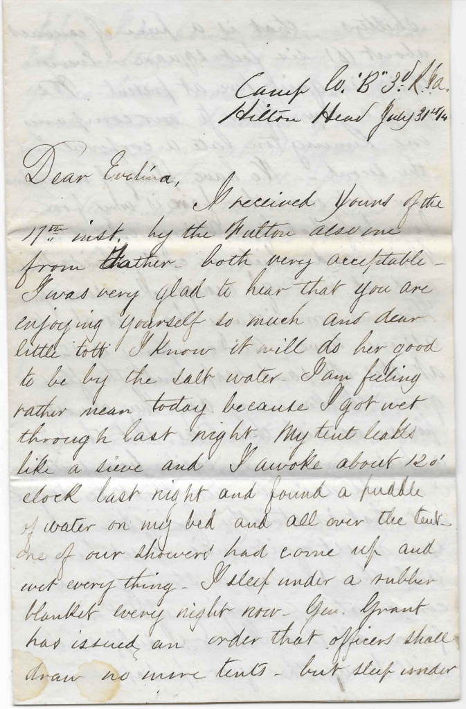I received yours of the 17th instant by the Fulton. Also one from Father. Both very acceptable. I was very glad to hear that you are enjoying yourself so much and dear little Tott. I know it will do her good to be by the salt water. I am feeling rather mean today because I got wet through last night. My tent leaks like a sieve and I awoke about 12 o’clock last night and found a puddle of water on my bed and all over the tent. One of our showers had come up and wet everything. I sleep under a rubber blanket every night now. Gen. Grant has issued an order that officers shall draw no more tents but sleep under shelters—that is, a piece of canvass about 6 feet square.