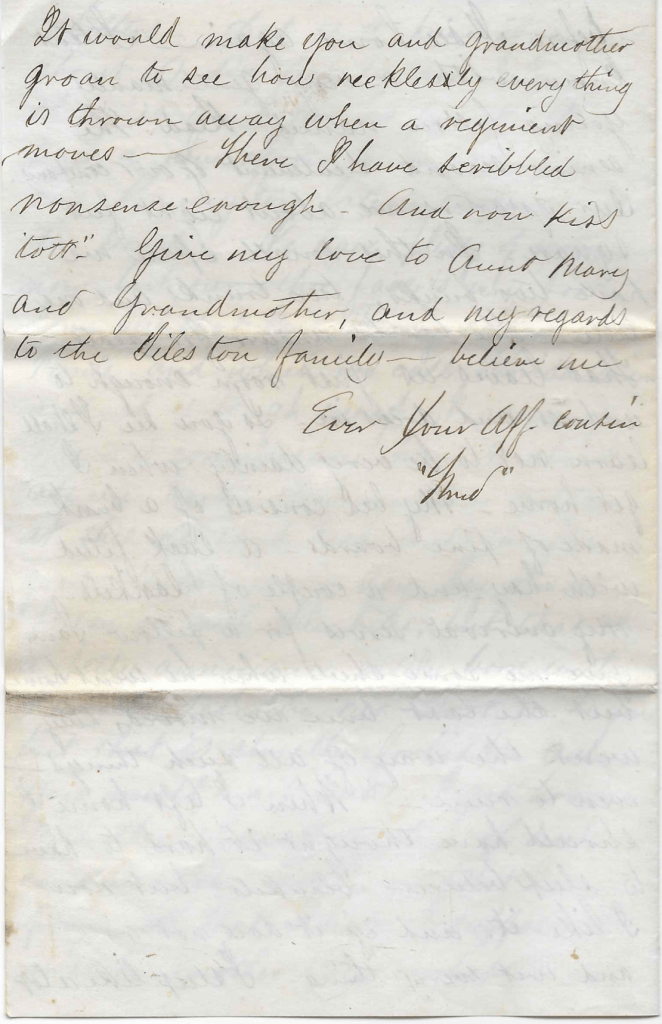I must draw this letter to a close. Tell John G. Royce that every man in the regiment is a running to me for some of Royce’s Relief. They say it is the greatest thing for tooth ache that they ever saw. Give my respects to Asenath Green and tell her that if I was at home, I would like to go to her school this winter. Give my best respects to John & Hattie, but must close. Give my love to father and tell him to keep up good spirits until I get home which I hope will not be long.