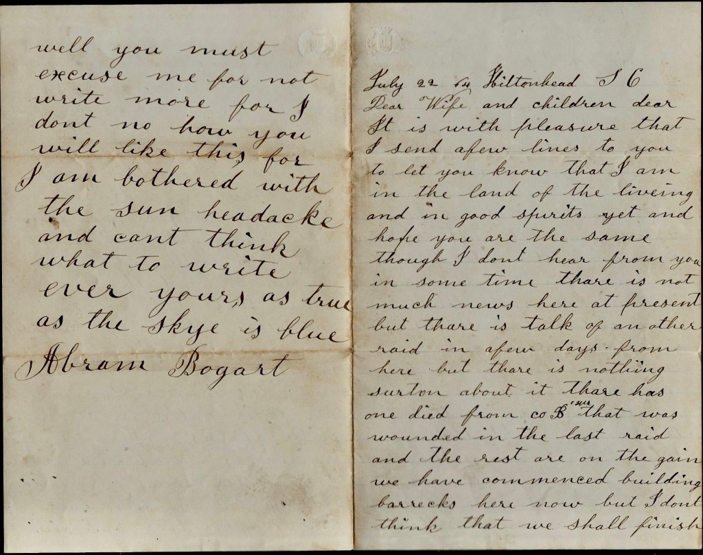 Well you must excuse me for not writing more for I don’t know how you will like this for I am bothered with the sun headache and can’t think what to write. Ever yours as true as the sky is blue. — Abram Bogart
