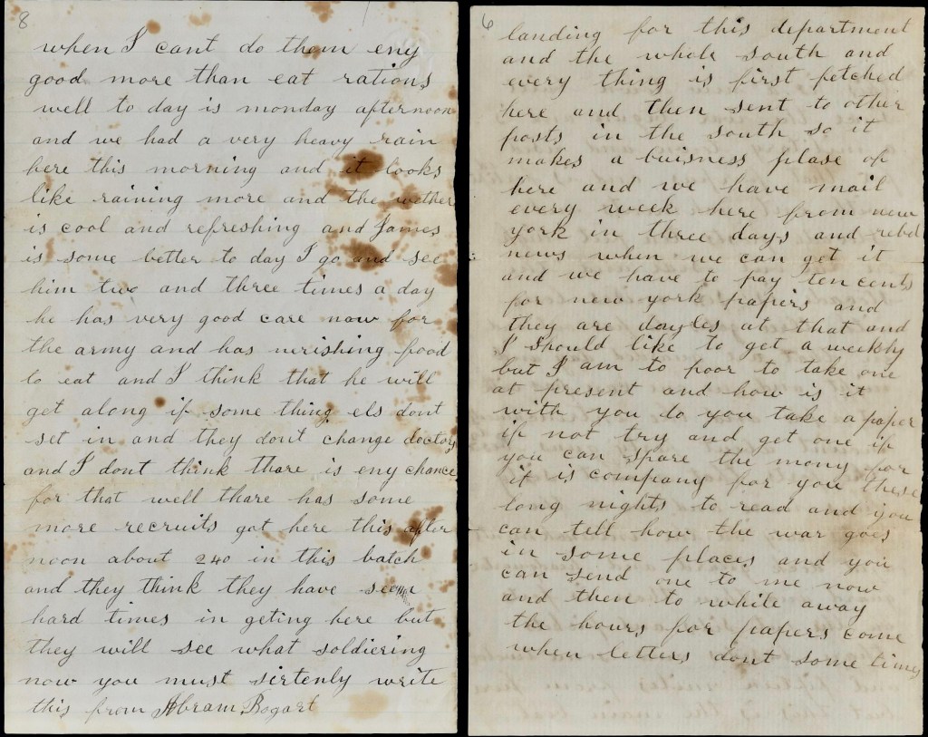 Well, today is Monday afternoon and we had a very heavy rain here this morning and it looks like raining more and the weather is cool and refreshing and James is some better today. I go and see him two and three times a day. He has very good care now for the army has nourishing food to eat and I think that he will get along if something else don’t set in and they don’t change doctors and I don’t think there is any chance for that. Well there has some more recruits got here this afternoon about 240 in this batch and they think they have some hard times in getting here but they will see what soldiering is. Now, you must certainly write.